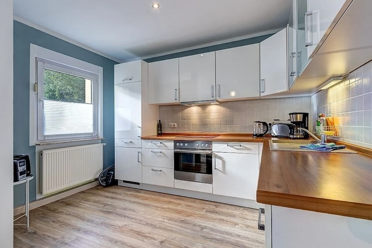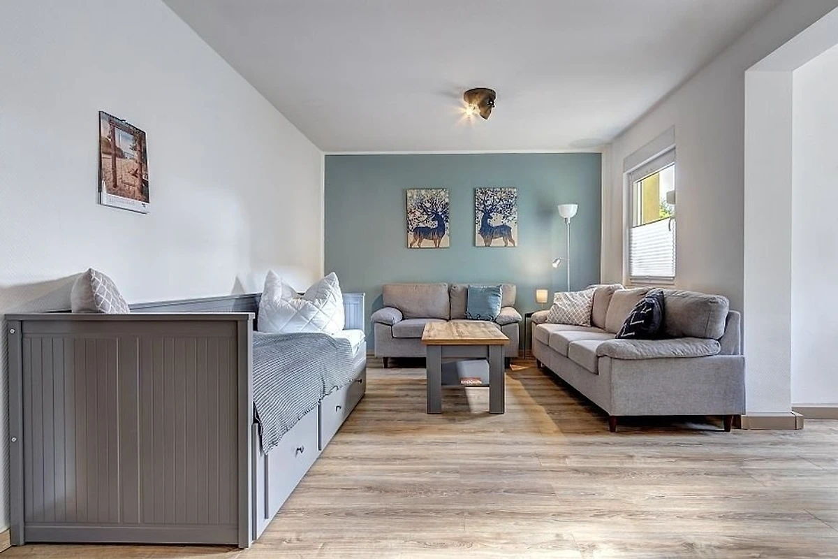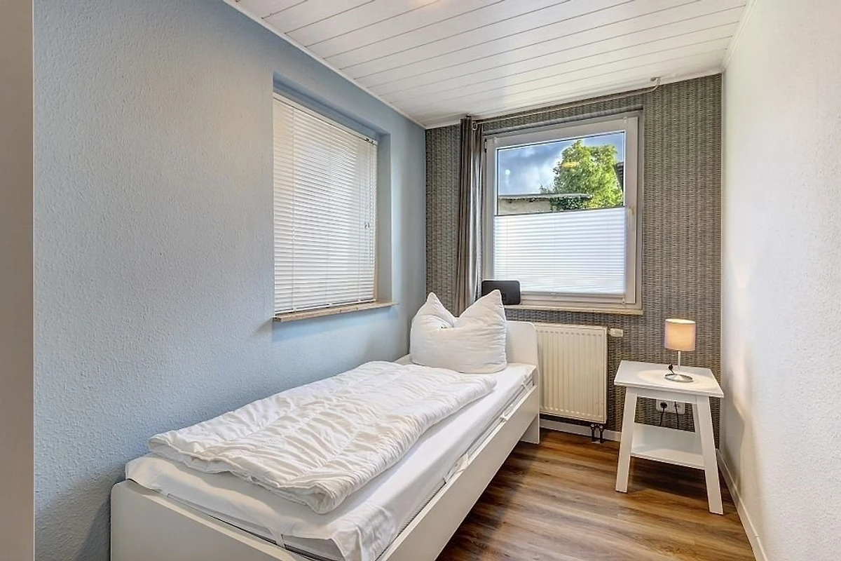 Die mit 80 qm sehr grosse komfortable Ferienwohnung verfügt über ein helles Wohn- und Esszimmer (mit einem ausziehbaren Hemnes-Bett 200 x 180 cm sowie einer möglichen Aufklapp-Aufbettung 200 x 90 cm), ein grosses Schlafzimmer (mit Doppelbett 200 x 180 cm), ein kleines Schlafzimmer (mit Einzelbett 200 x 90 cm), eine zum Wohnzimmer hin offene Küche, ein Bad mit ebenerdiger Dusche und eine Terrasse. Im geräumigen Wohn-/Essbereich sind ausreichend Sitzgelegenheiten vorhanden, um das in der voll ausgestatteten Küchenzeile (Backofen, Spülmaschine, Spüle, Kaffeemaschine) zubereitete Essen zu sich zu nehmen.