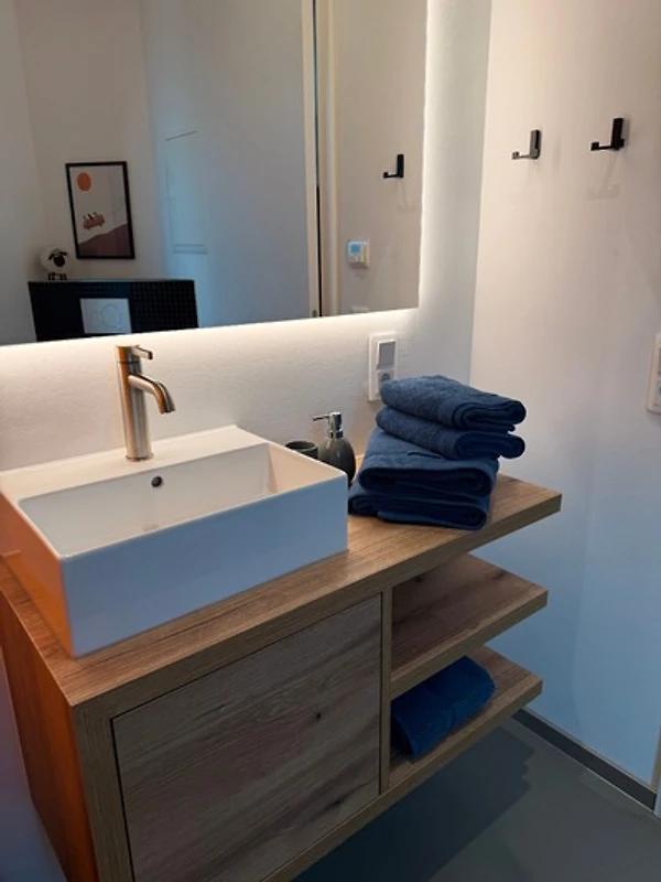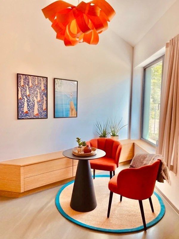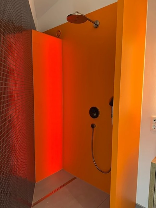 In diesem Ferienzimmer erwartet Sie ein luxuriöses Badezimmer, das mit einer atemberaubenden Regenwalddusche ausgestattet ist. Das sanfte Rauschen des Wassers bringt Ihnen nicht nur Entspannung, sondern erzeugt auch positive Energie, die Ihren Geist und Körper revitalisiert. Besonders die orange hinterleuchtete Dusche sorgt für eine angenehme Atmosphäre und ein Gefühl der Wärme, das Ihren Aufenthalt zu einem unvergesslichen Erlebnis macht. Lassen Sie die Sorgen des Alltags hinter sich und geniessen Sie das erfrischende Erlebnis in Ihrem eigenen kleinen Paradies.