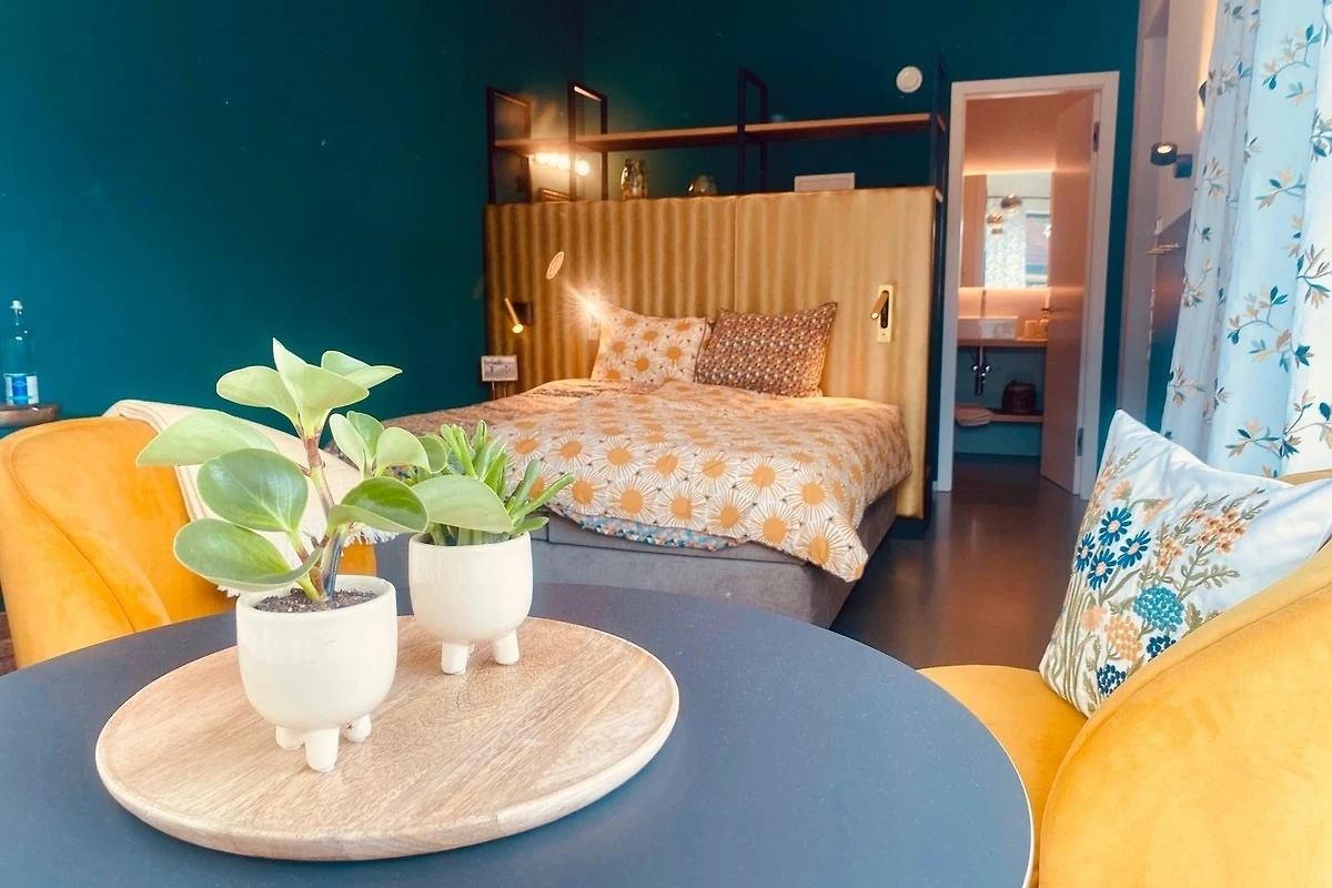 Die Gestaltung des Zimmers spielt eine entscheidende Rolle, um Gästen eine einladende und entspannende Atmosphäre zu bieten. Ein durchdachtes Farbschema aus Holz in leuchtendem Gelb und beruhigendem Petrol schafft ein warmes und einladendes Ambiente. Bequeme Boxspringbetten laden zu erholsamen Nächten ein, während eine stilvolle Sitzecke ideal für das Lieblingsbuch oder eine gesellige Tasse Tee ist.
