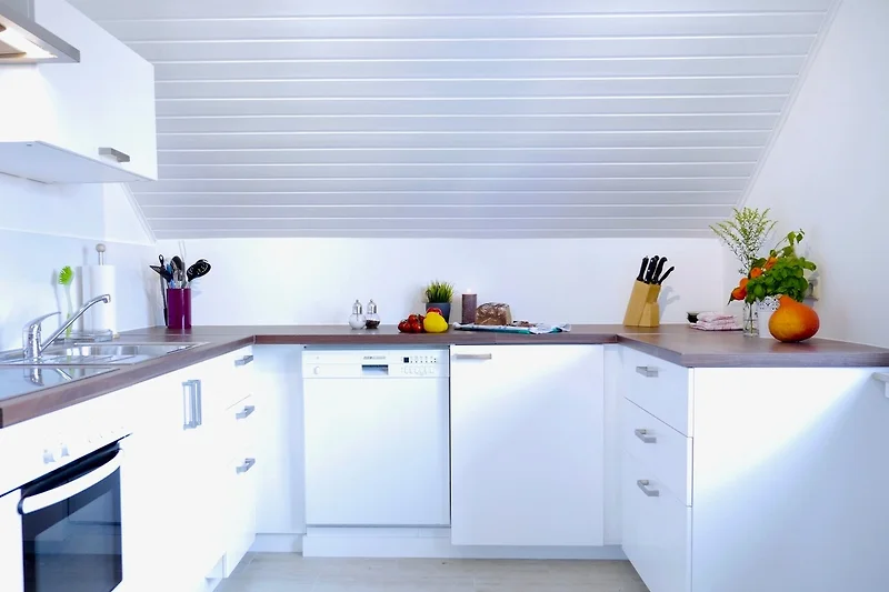 Die Küche verfügt über eine Spülmaschine, Kühl-Gefrierkombination, Herd mit Ceranfeld und Backofen, Mikrowelle, Toaster, Wasserkocher und Kaffeemaschine. Selbstverständlich sind alle notwendigen Küchen und Putzutensilien inklusiv genügend Geschirr, Gläser, Töpfe etc. vorhanden (alles, was ich selbst immer in Ferienwohnungen vermisst habe- auch eine gute Pfanne und schneidende Messer!!).