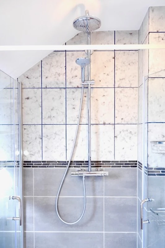 Das Bad bietet einen Waschtisch mit Unterschrank, ebenerdige Dusche als Rainshower, WC.