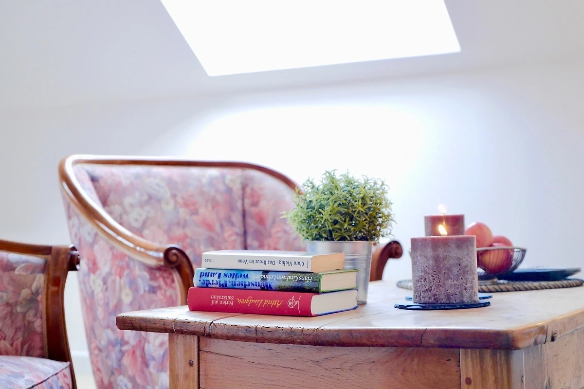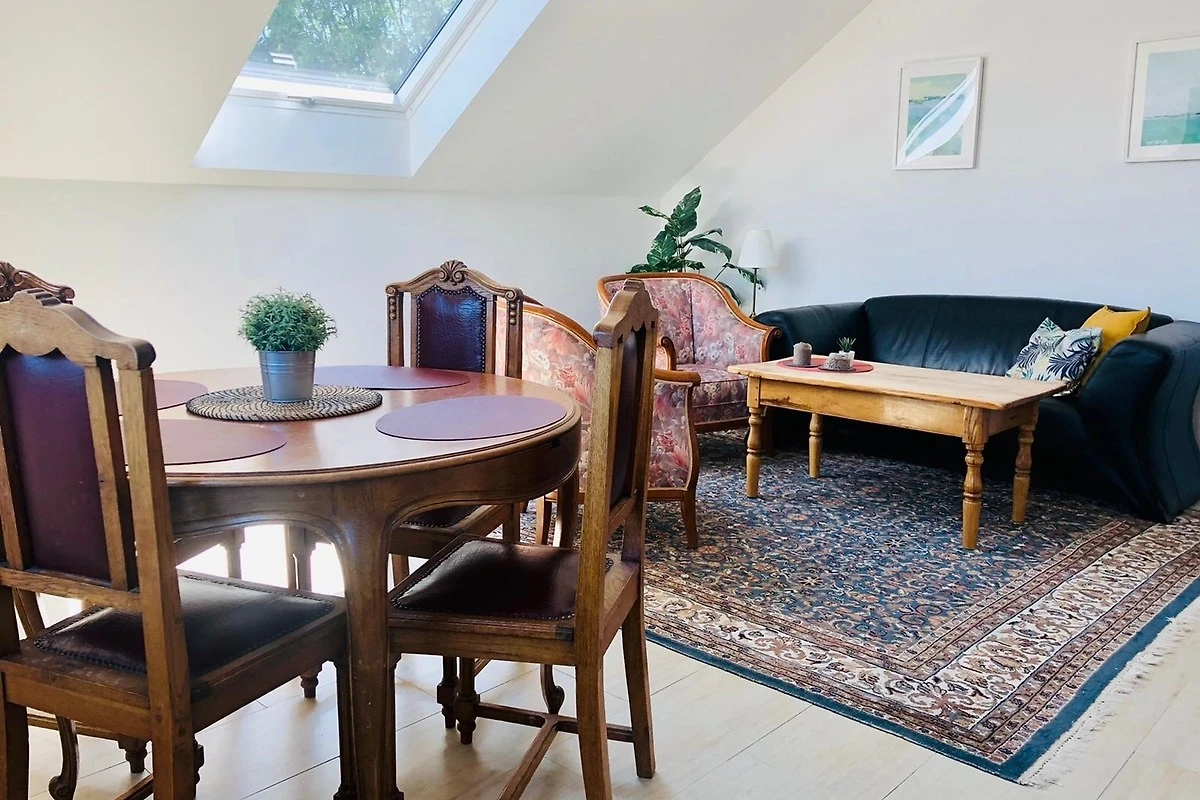 Im Wohnzimmer befindet sich ein Essplatz für 4-5 Personen, eine gemütliche Couchecke sowie TV und DVD Player, aber auch Gesellschaftsspiele und viele Bücher für gemütliche Leseabende.