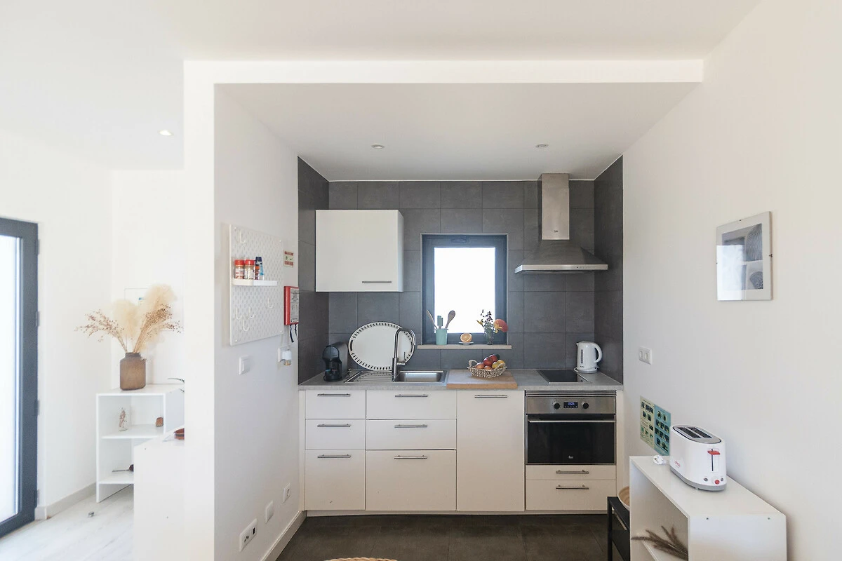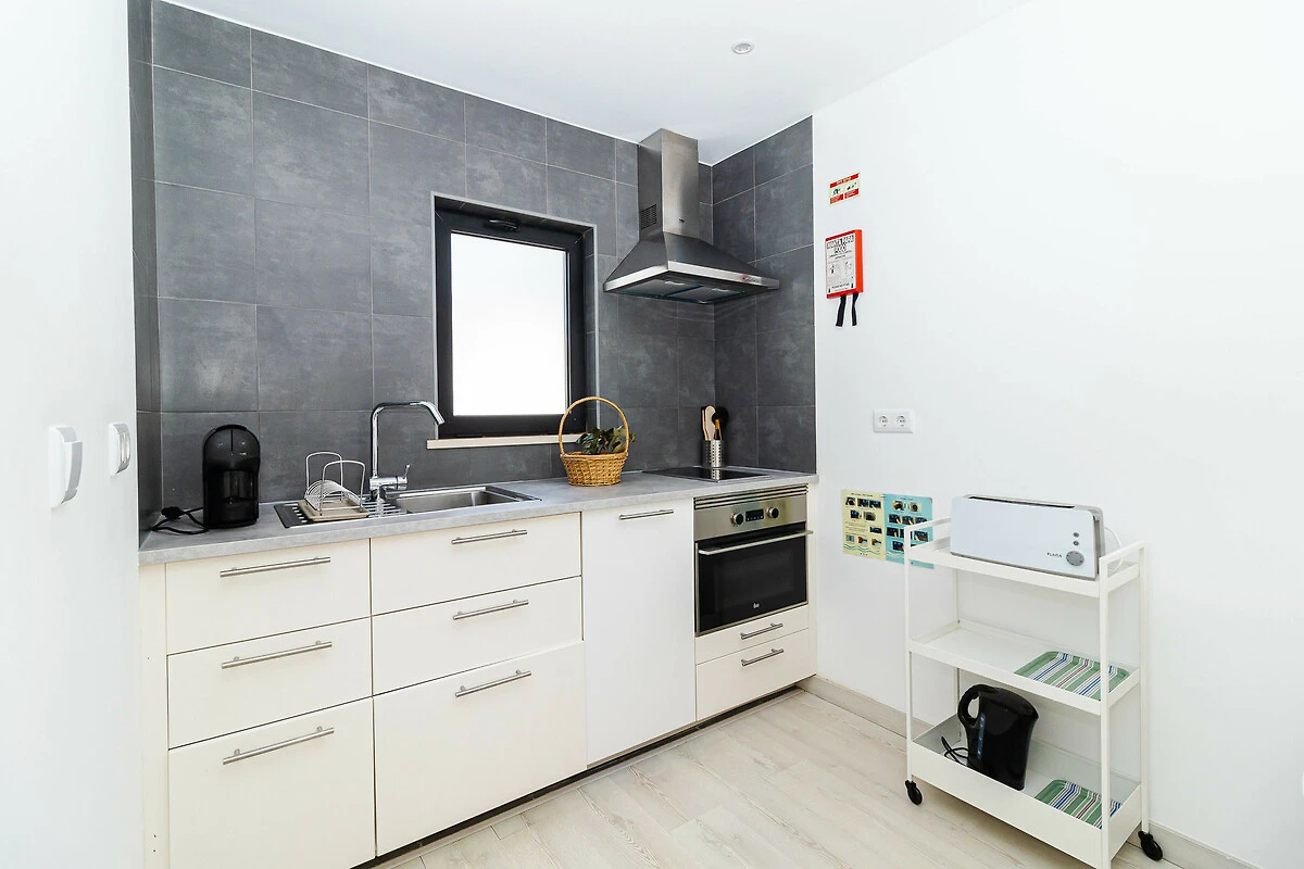 Dieses offene küche, ist ausgestattet in kühlschrank, mikrowelle, backofen, gefrierschrank, spülmaschine, geschirr/besteck, kochutensilien, kaffeemaschine, toaster, wasserkocher und saftpresse.