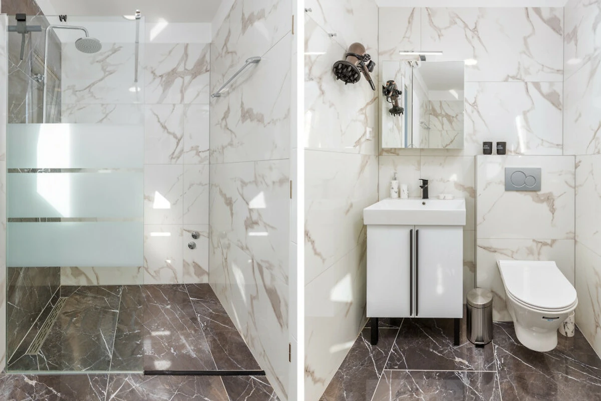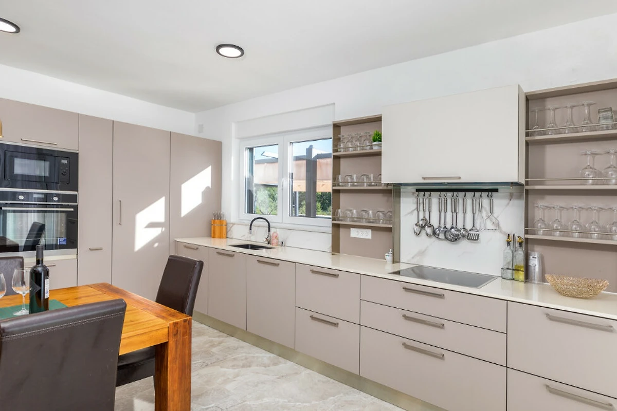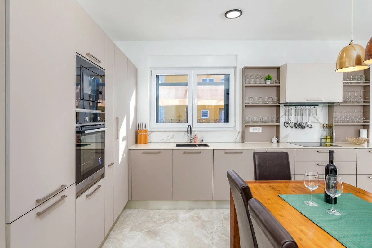 Die moderne amerikanische Küche ist vollständig ausgestattet mit hochwertigen Geräten, einschliesslich einer Glaskeramik-Kochplatte, Kühlschrank, Gefrierschrank, Backofen, Mikrowelle, Geschirrspüler, Kaffeemaschine und Toaster. Die Gäste werden das umfassende Küchengeschirr und die Teller zu schätzen wissen, was die Zubereitung von Mahlzeiten zu einem Vergnügen macht.