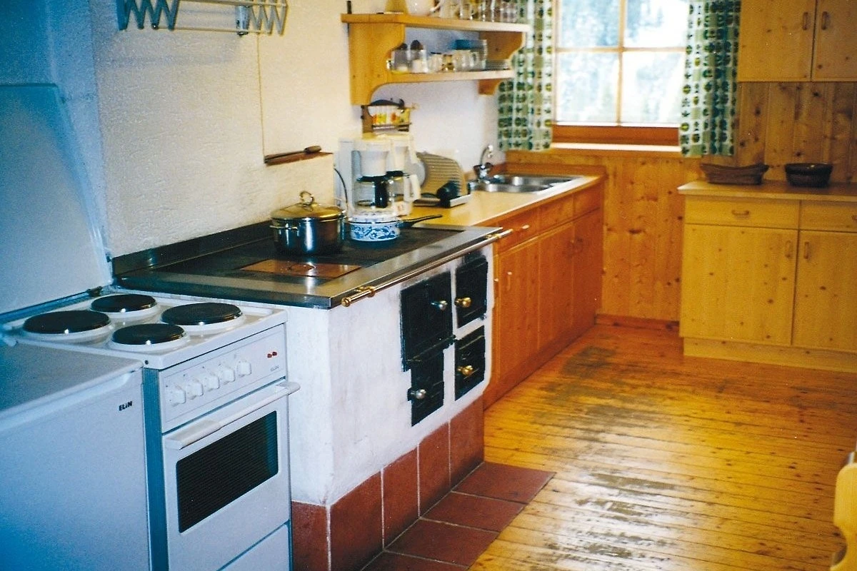 Voll ausgestattete Küche mit Elektroherd, Backofen, Holzherd, Geschirrspüler, Kaffeemaschine, Kühl- & Gefrierschrank