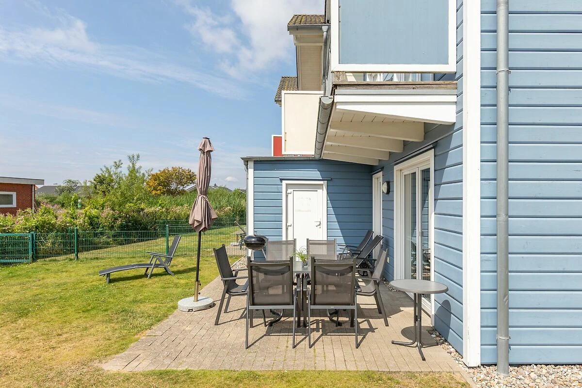 Auf der überdachten, windgeschützten Terrasse können Sie auf bequemen Gartenstühlen die Sonne genießen.