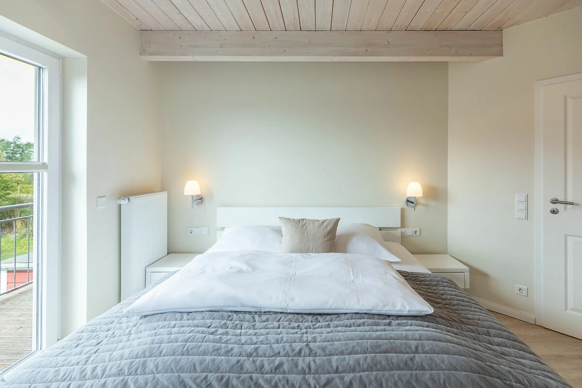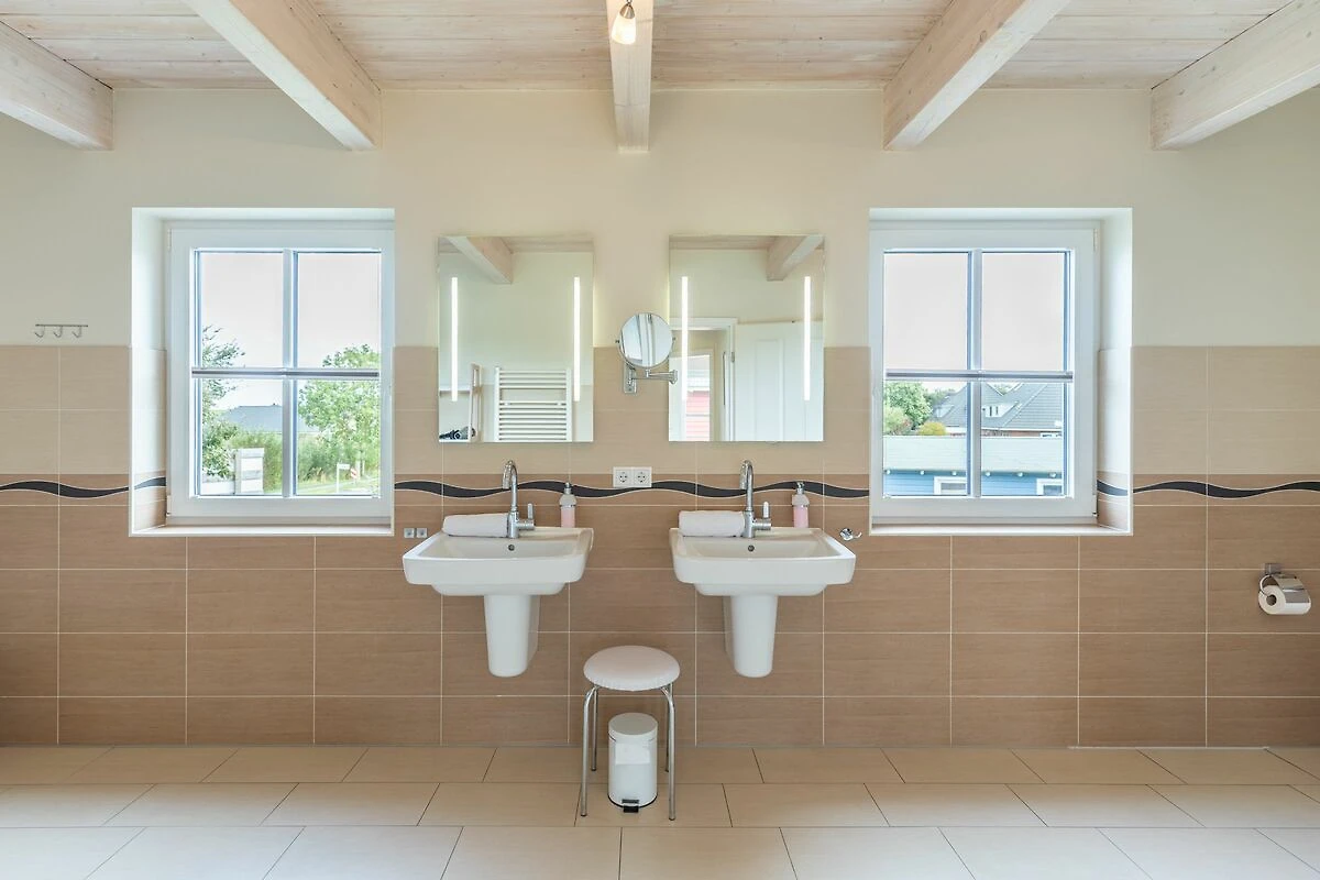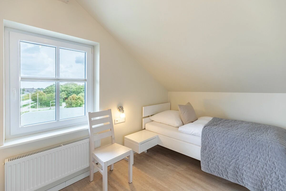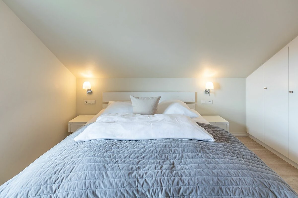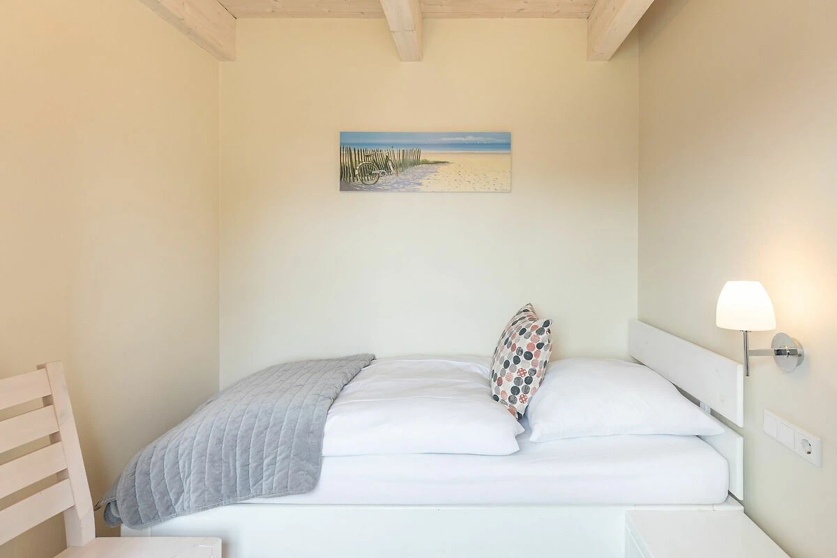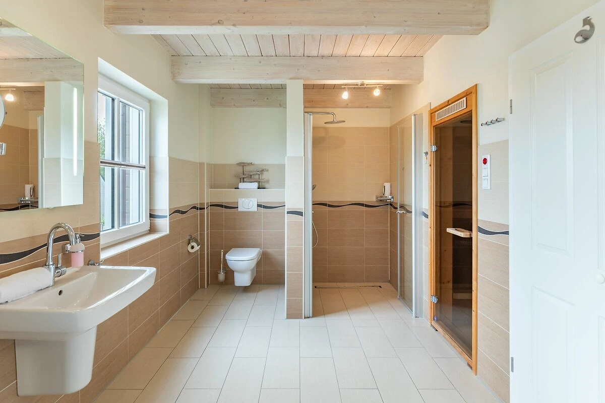 Das zweite Schlafzimmer liegt mit einem Doppelbett mit der Größe von 180x200cm im ersten Obergeschoss. Auf dieser Ebene finden Sie auch das große Badezimmer mit Dusche, Badewanne sowie zwei Waschbecken. Die Sauna rundet das Bild ab und lädt ein zum Verweilen für gemütliche Stunden. Das dritte und vierte Schlafzimmer befinden sich im zweiten Obergeschoss, eines mit jeweils zwei Einzelbetten (90x200cm) und ein weiteres Doppelbett mit der Größe von 180x200cm. Im zweiten Obergeschoss befindet sich noch ein zusätzliches Gäste-WC.