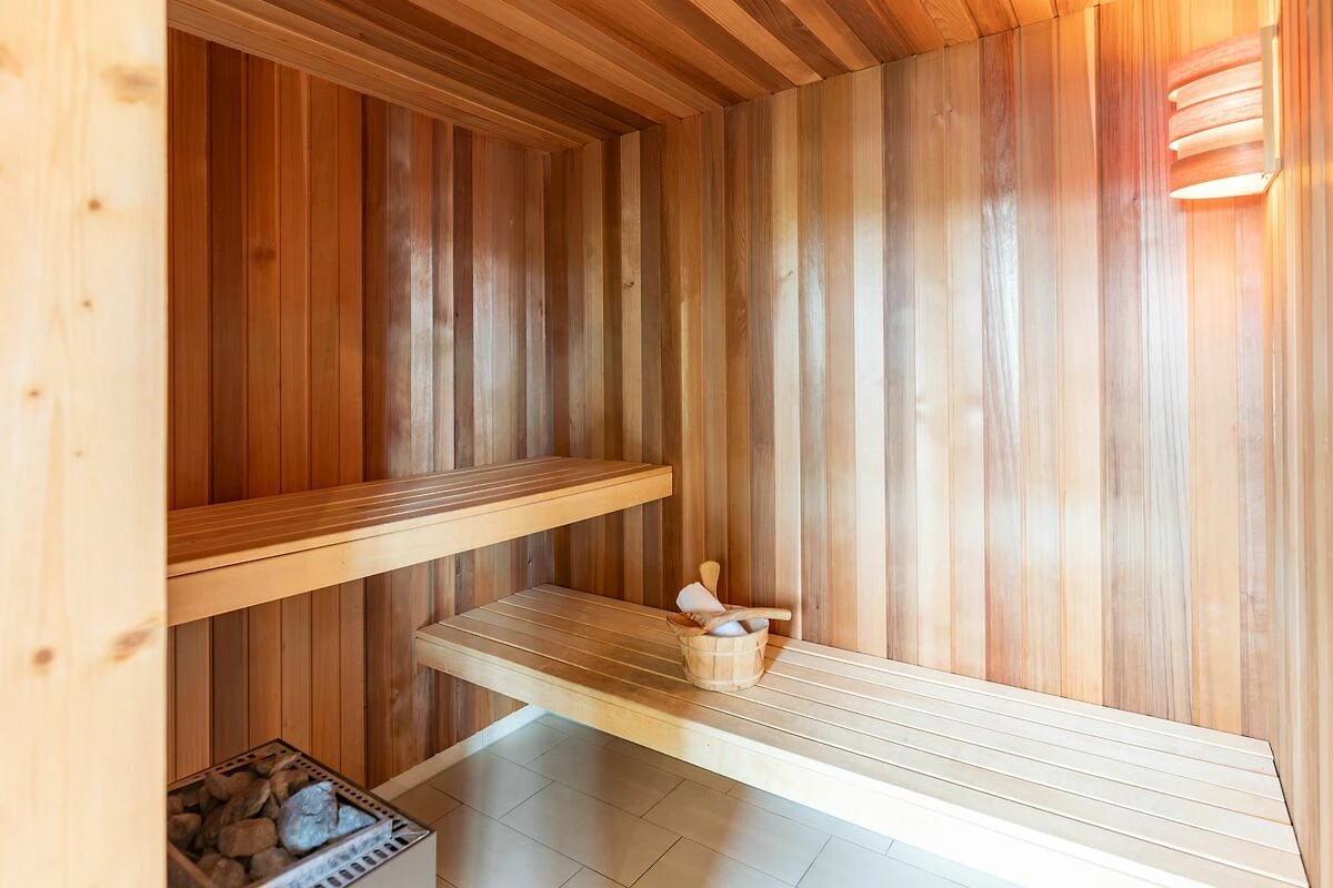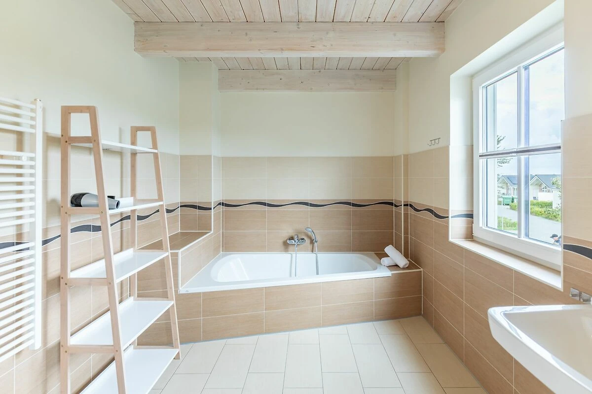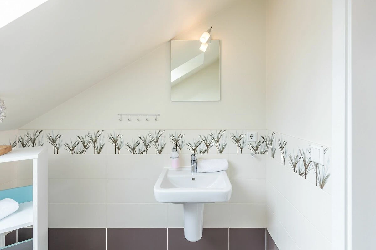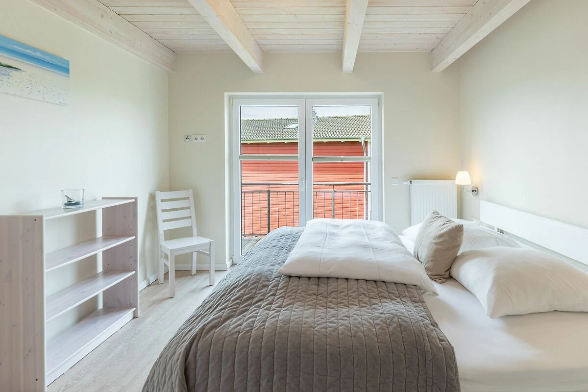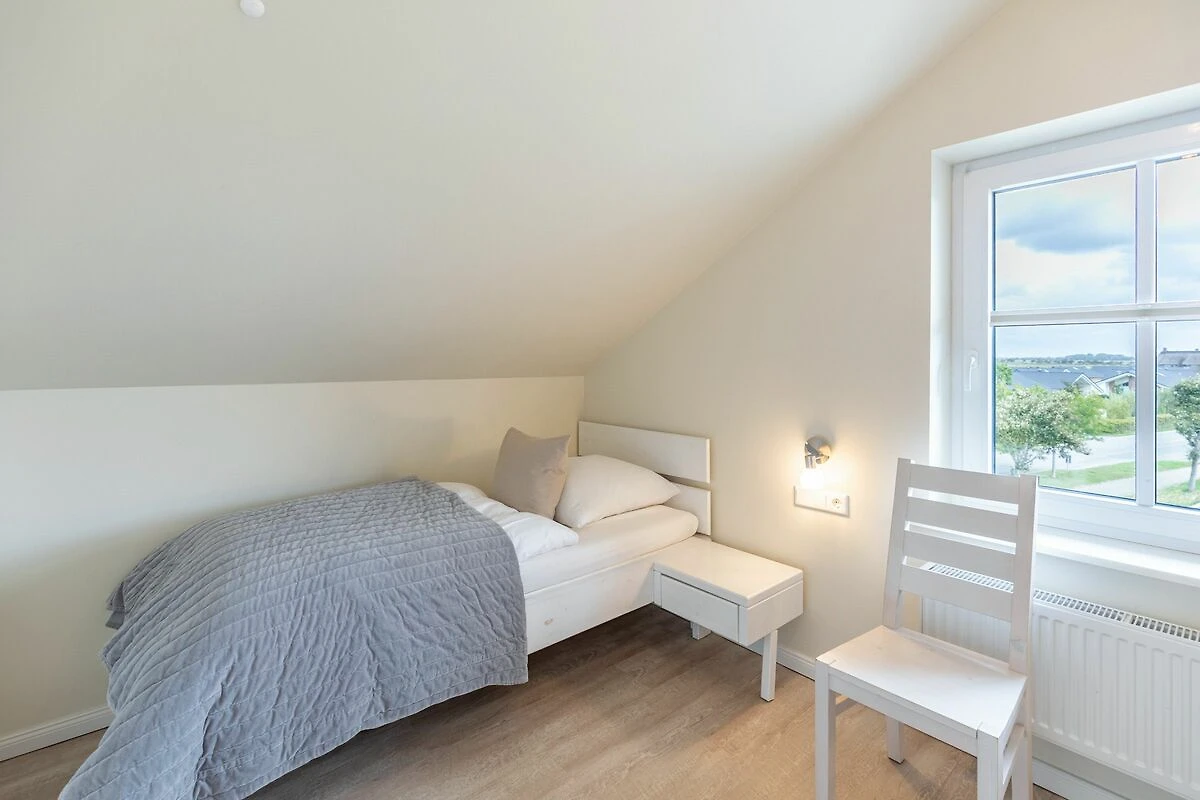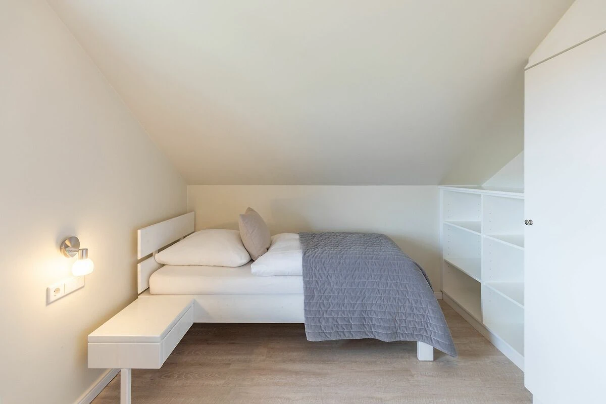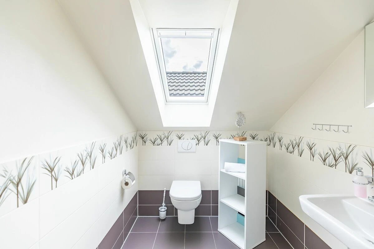 Das zweite Schlafzimmer liegt mit einem Doppelbett mit der Größe von 180x200cm im ersten Obergeschoss. Auf dieser Ebene finden Sie auch das große Badezimmer mit Dusche, Badewanne sowie zwei Waschbecken. Die Sauna rundet das Bild ab und lädt ein zum Verweilen für gemütliche Stunden. Das dritte und vierte Schlafzimmer befinden sich im zweiten Obergeschoss, eines mit jeweils zwei Einzelbetten (90x200cm) und ein weiteres Doppelbett mit der Größe von 180x200cm. Im zweiten Obergeschoss befindet sich noch ein zusätzliches Gäste-WC.