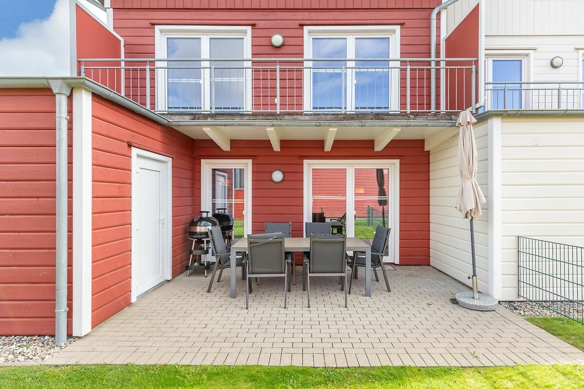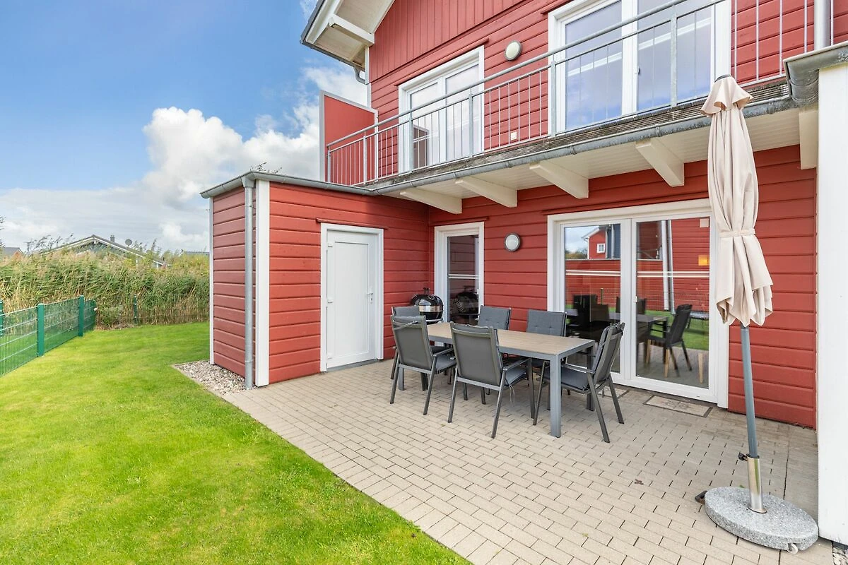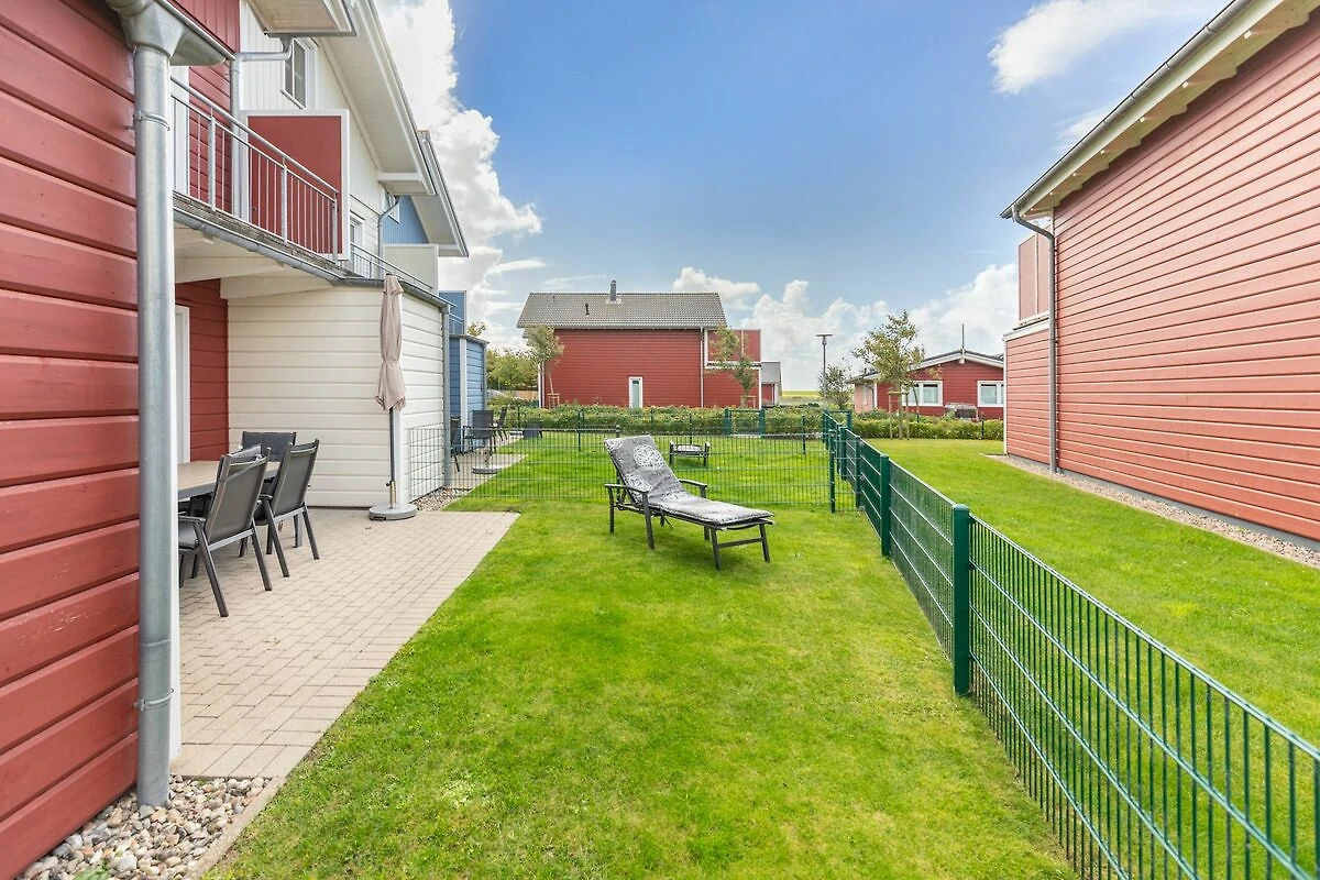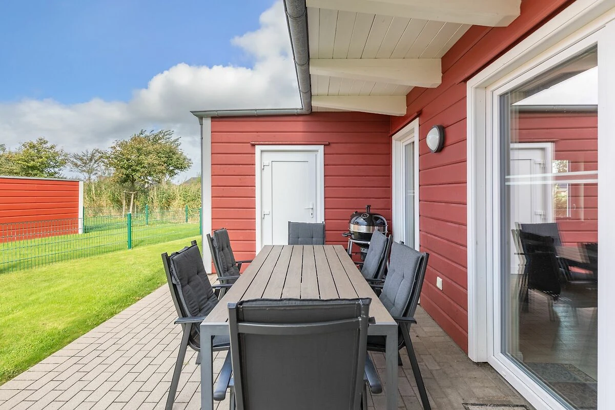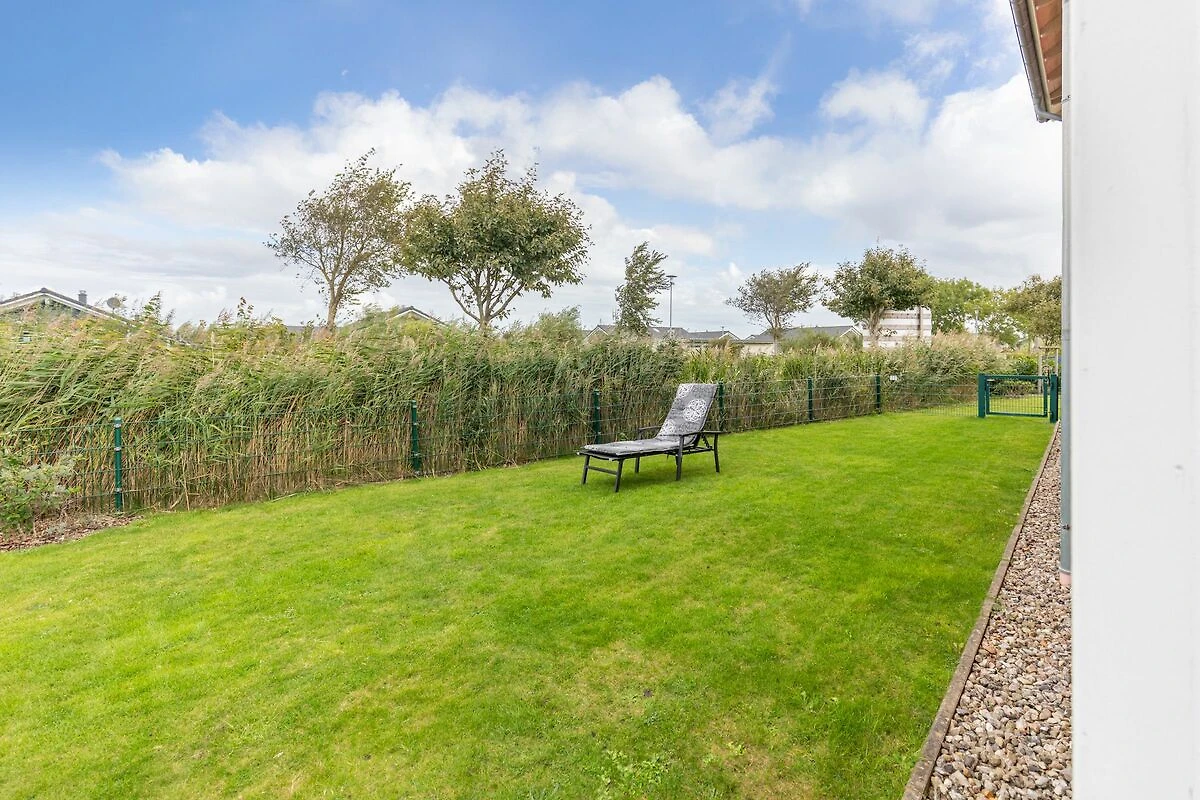 Auf der überdachten, windgeschützten Terrasse können Sie auf bequemen Gartenstühlen die Sonne genießen.