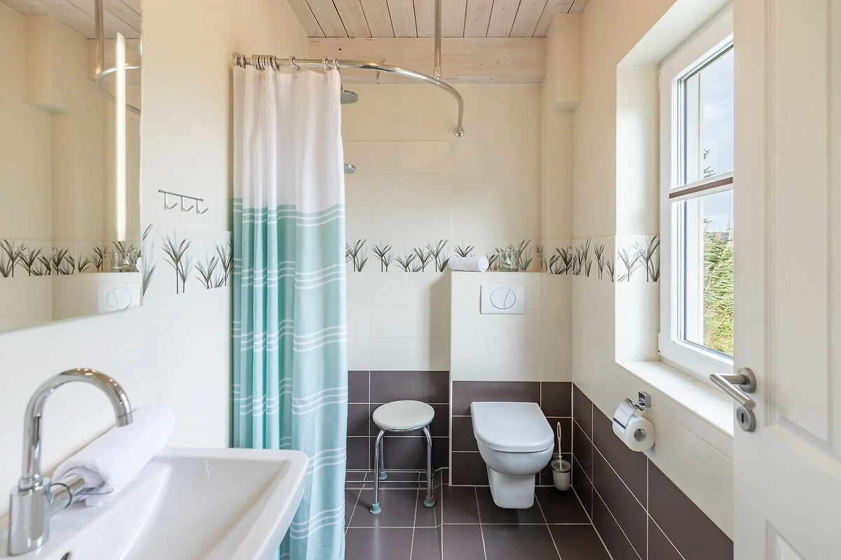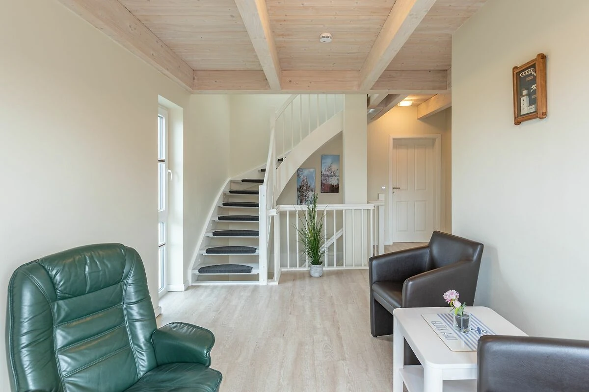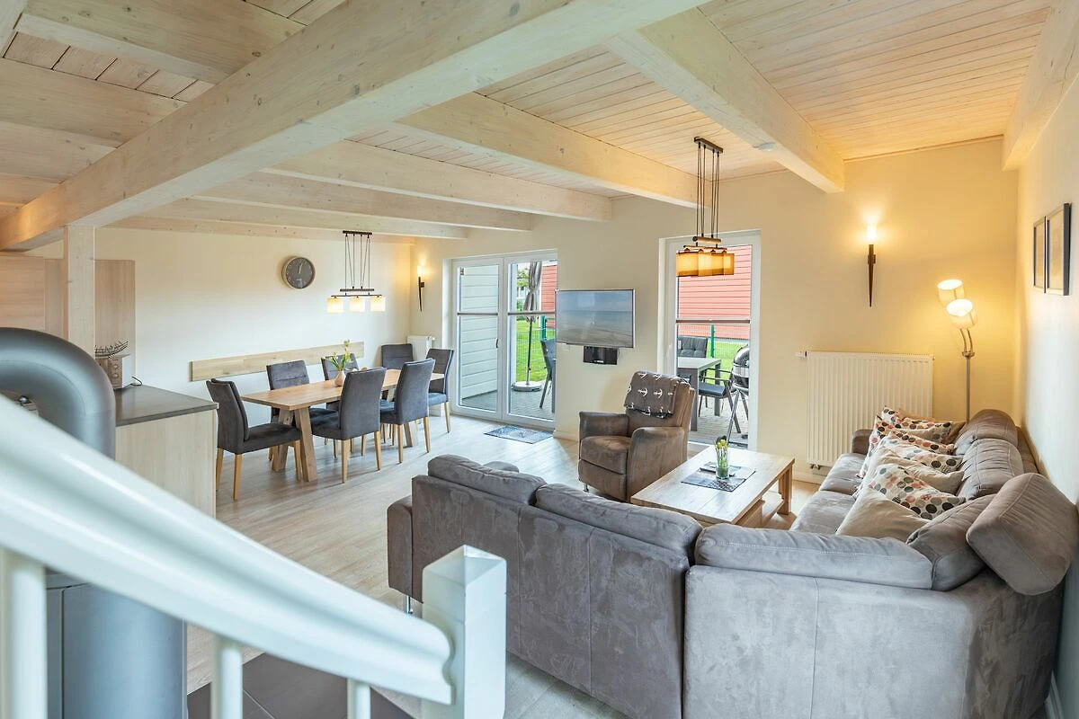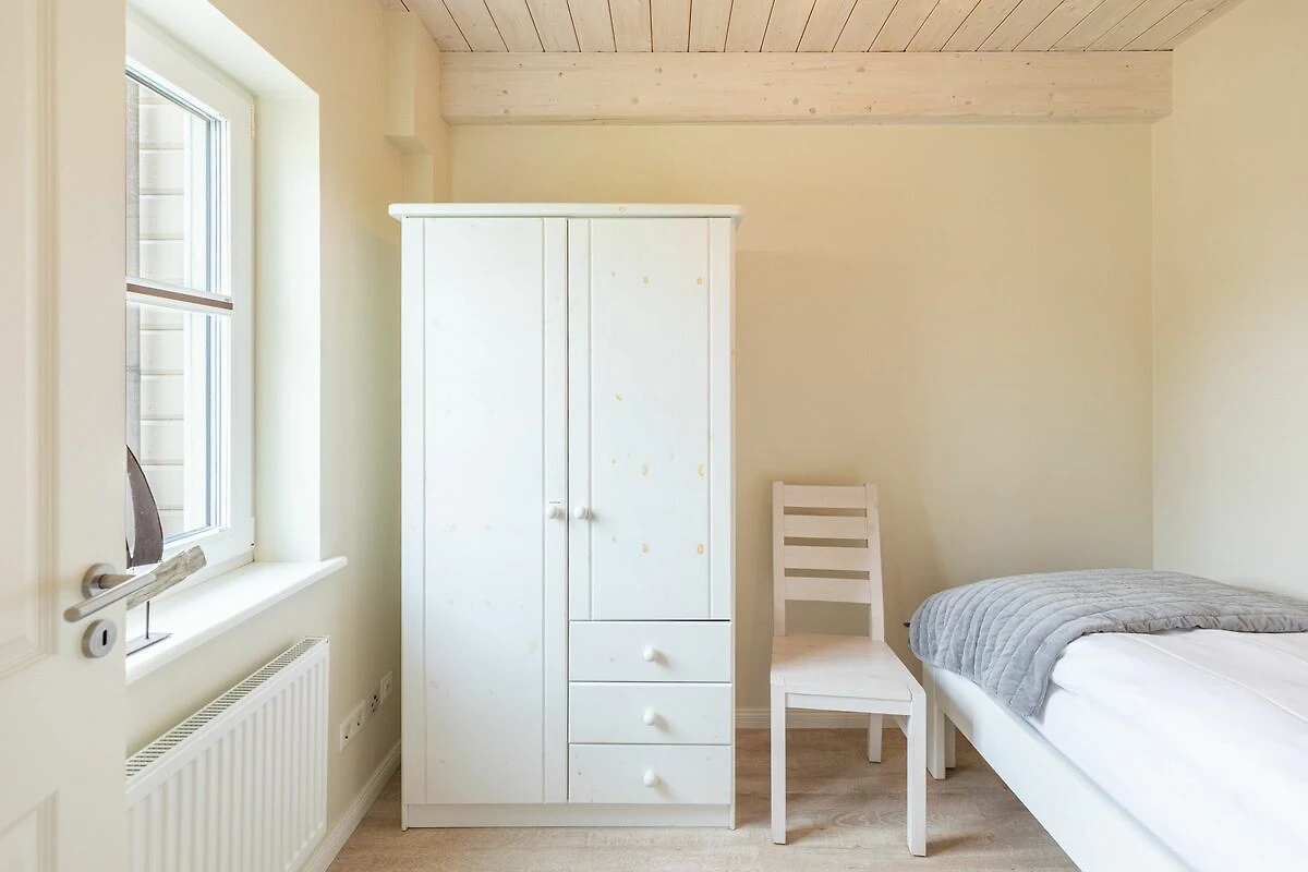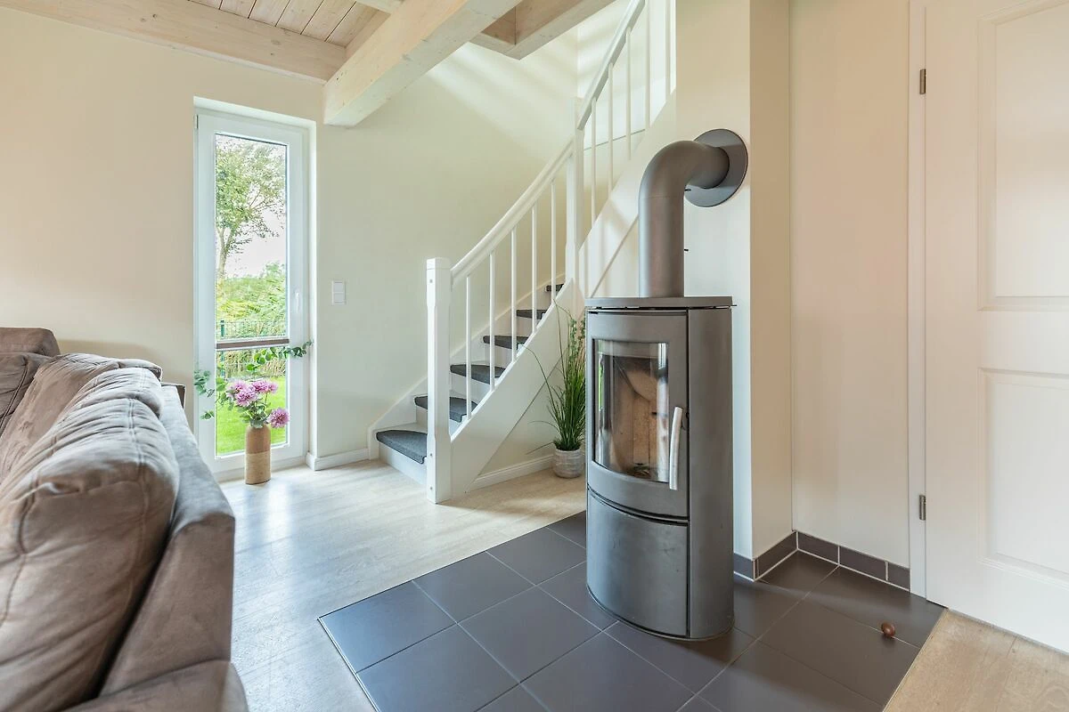 Eines der Schlafzimmer mit einem Einzelbett (90x200cm) liegt im Erdgeschoss, so dass das Haus auch für Gäste gut geeignet ist, die Treppen nur eingeschränkt nutzen können. Das gemütliche Wohnzimmer ist mit SAT-TV und einem Blu-Ray-DVD-Player ausgestattet. Der Kaminofen sorgt auch in der kälteren Jahreszeit für behagliche Stunden. Im Erdgeschoss befindet sich ebenfalls ein Badezimmer mit einer Toilette und einer ebenerdigen Dusche.