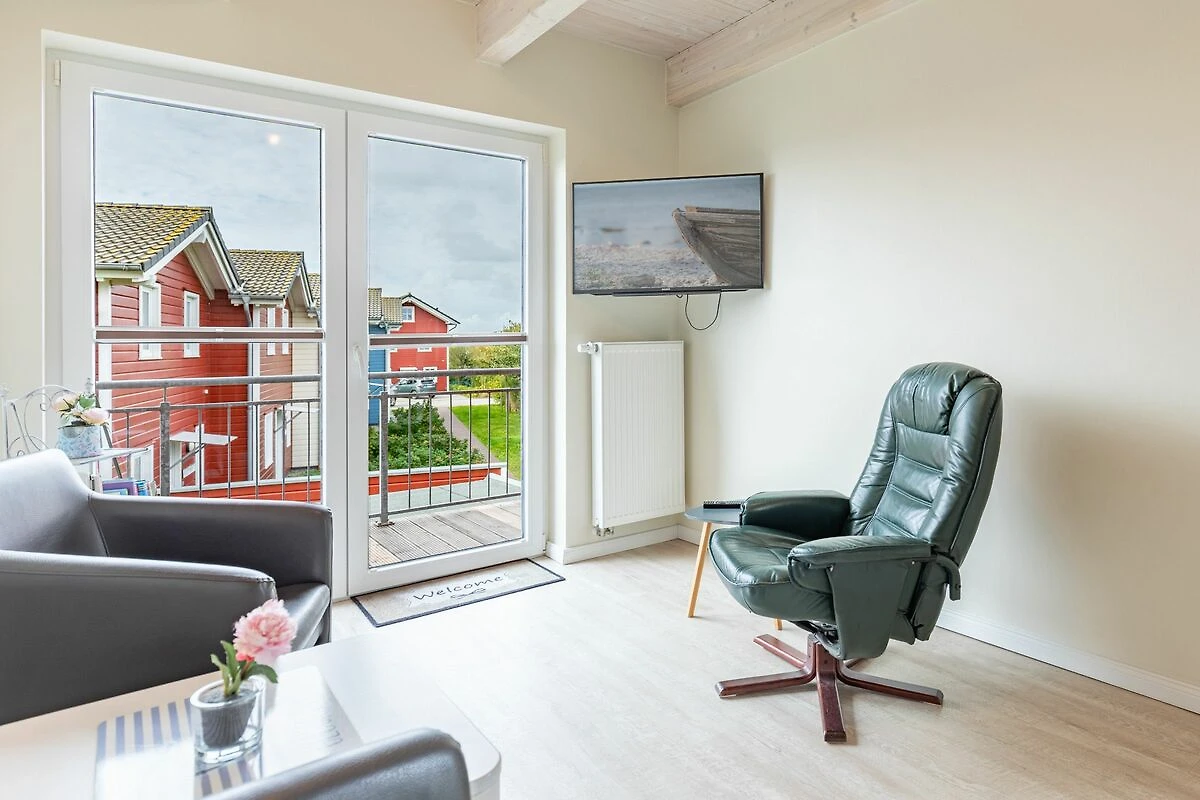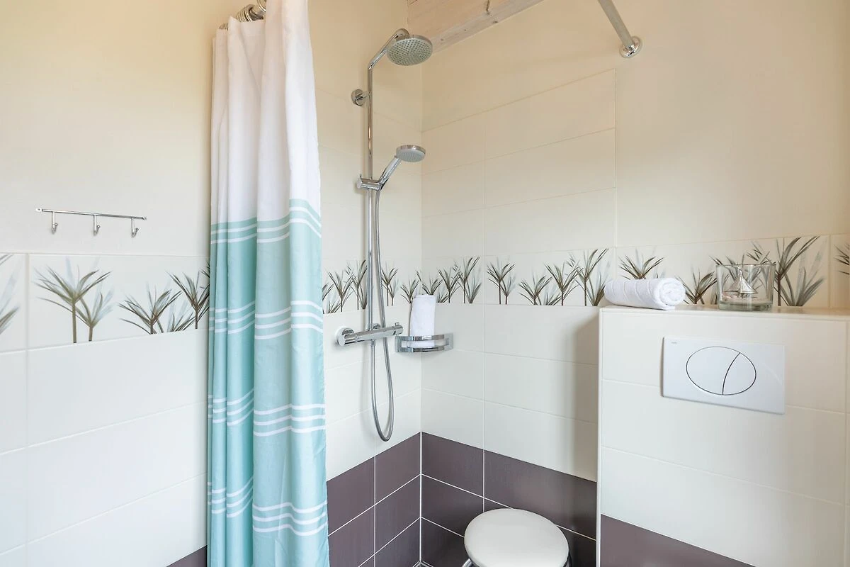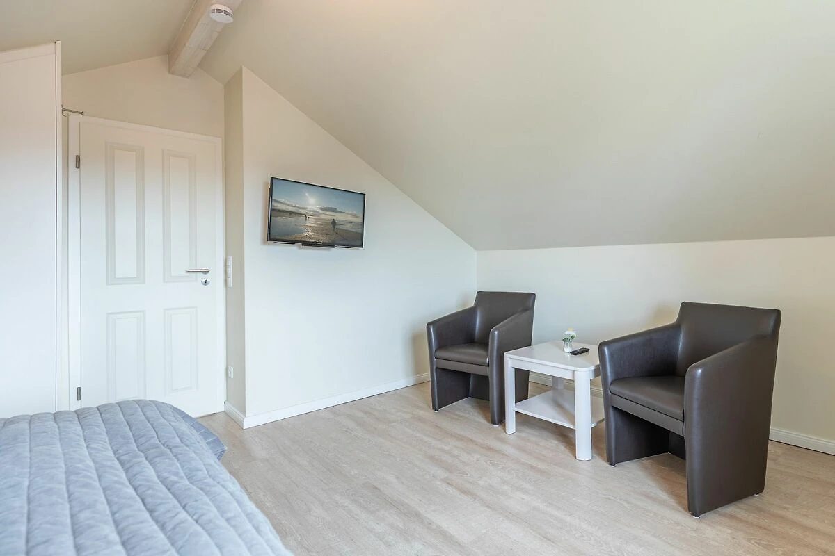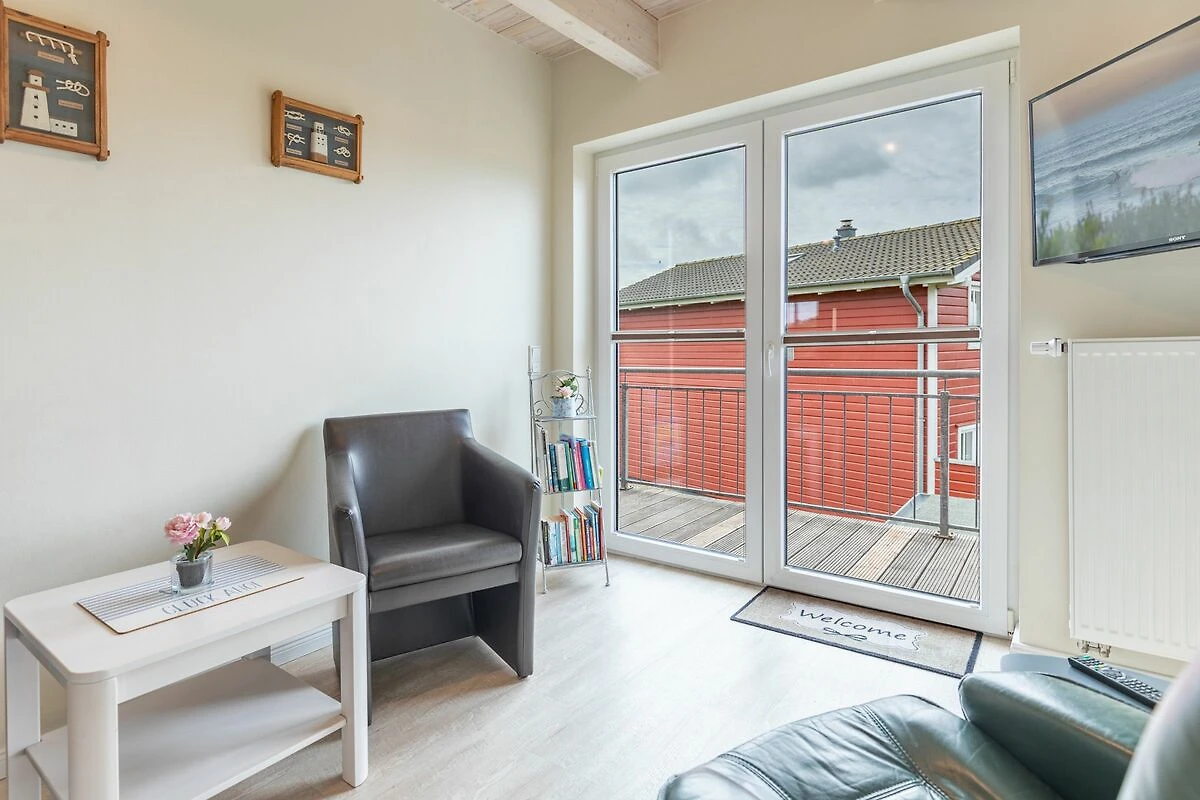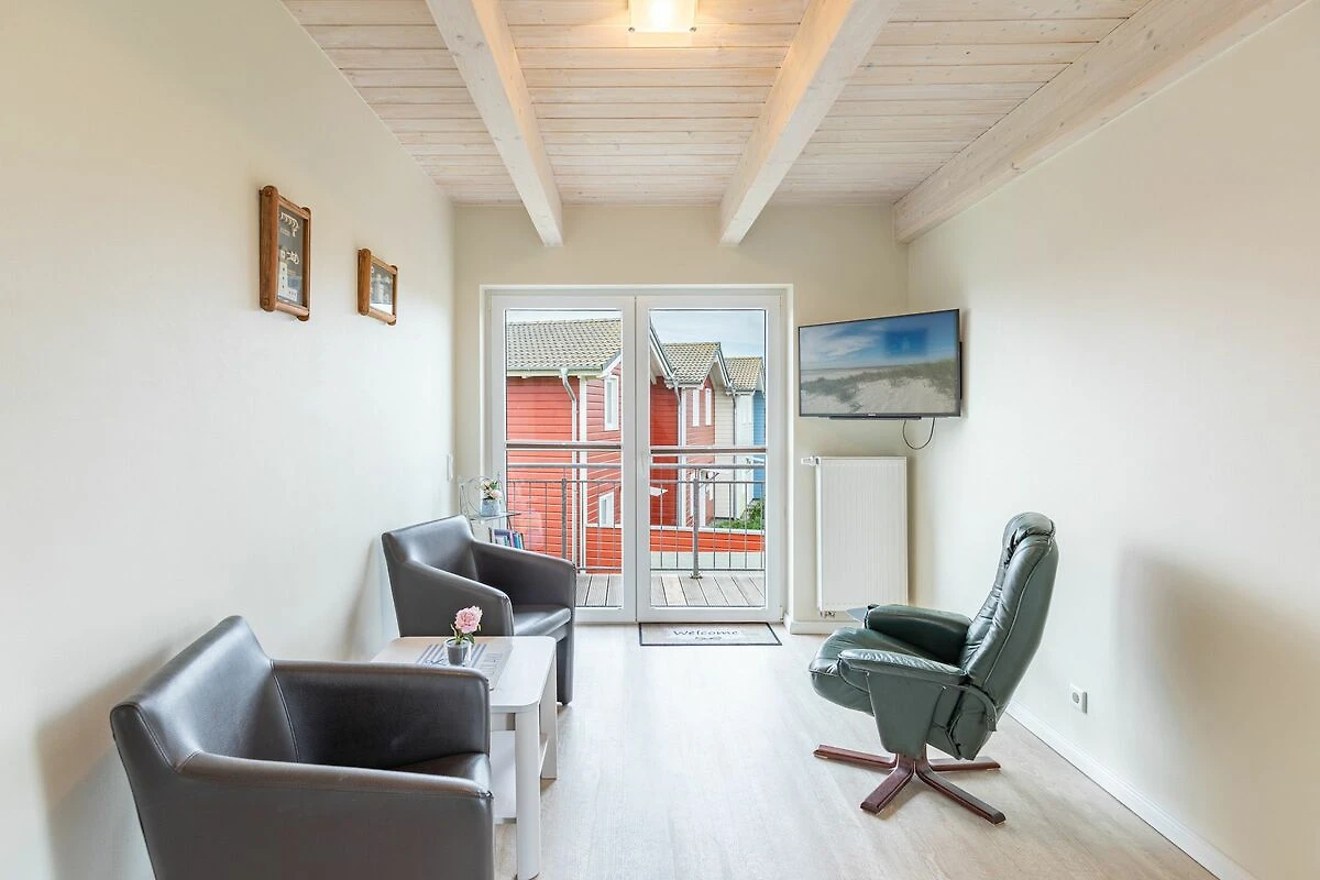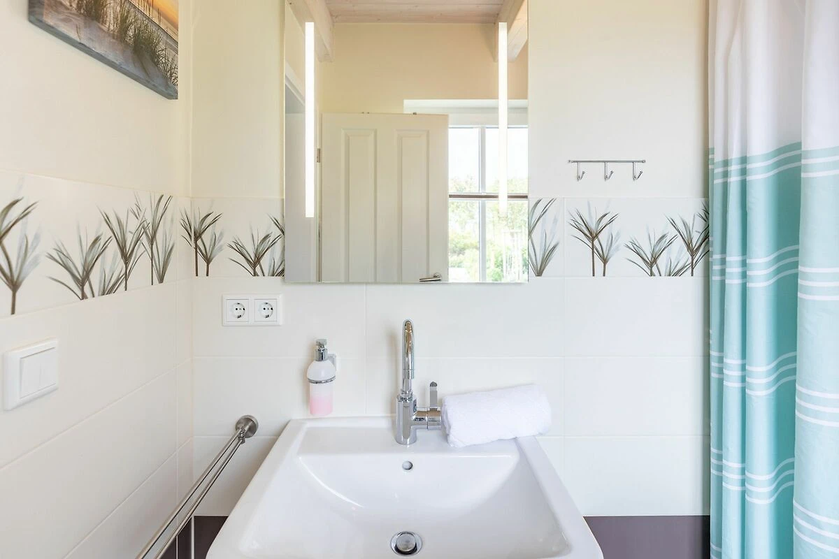 Eines der Schlafzimmer mit einem Einzelbett (90x200cm) liegt im Erdgeschoss, so dass das Haus auch für Gäste gut geeignet ist, die Treppen nur eingeschränkt nutzen können. Das gemütliche Wohnzimmer ist mit SAT-TV und einem Blu-Ray-DVD-Player ausgestattet. Der Kaminofen sorgt auch in der kälteren Jahreszeit für behagliche Stunden. Im Erdgeschoss befindet sich ebenfalls ein Badezimmer mit einer Toilette und einer ebenerdigen Dusche.