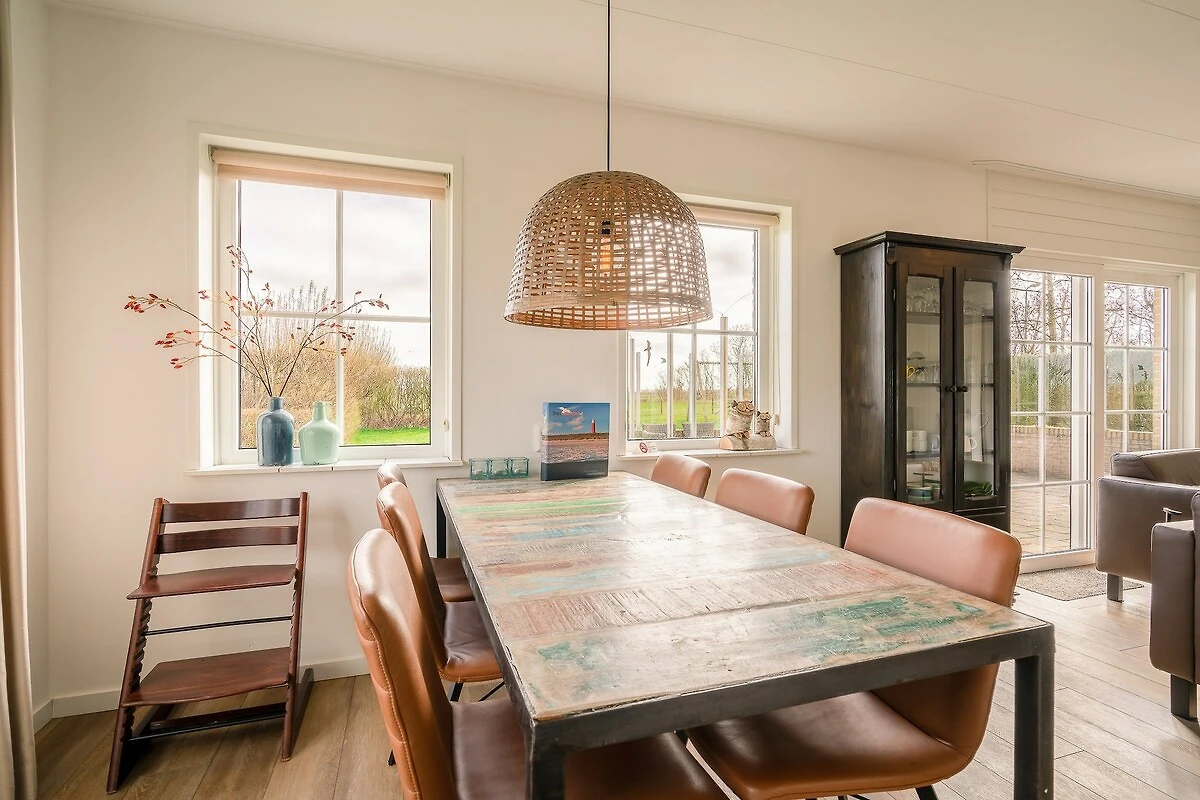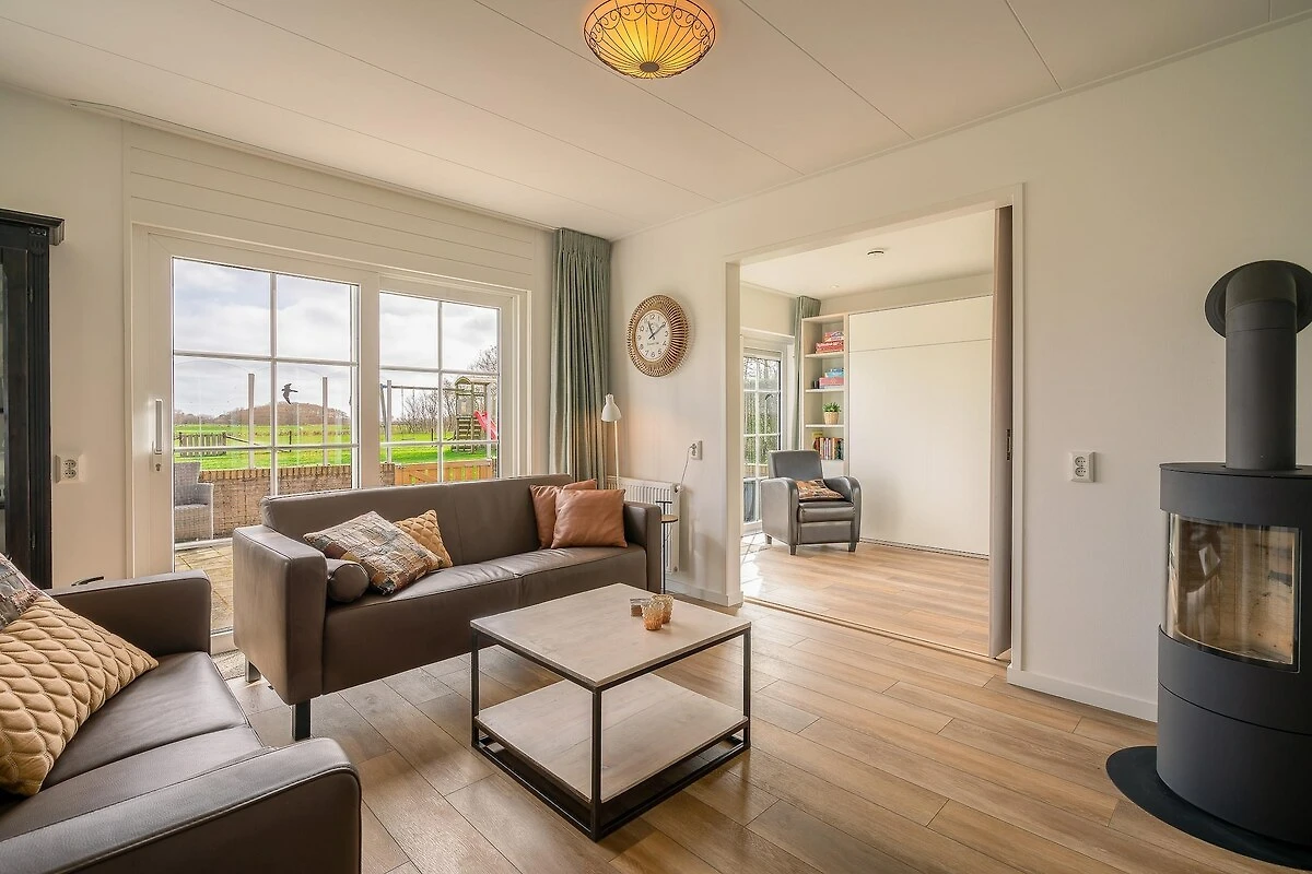 Das Wohnzimmer verfügt über eine Sitzecke mit Fernseher, Musikanlage und Holzofen. Das Anzünden des Holzofens sorgt für eine warme und einladende Atmosphäre. Es gibt einen geräumigen Essbereich mit einem Esstisch für sechs Personen. Vom Wohnzimmer aus haben Sie einen Panoramablick über die Felder. Die geräumige offene Küche ist komplett ausgestattet und verfügt unter anderem über einen Geschirrspüler, eine Kombi-Mikrowelle und verschiedene Kaffeemaschinen.