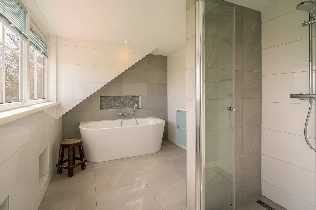 Es gibt drei Schlafzimmer: zwei Doppelzimmer und ein Einzelzimmer. Alle Schlafzimmer befinden sich im ersten Stock und sind mit bequemen Boxspringbetten ausgestattet. Ein Doppelzimmer verfügt über ein eigenes Badezimmer mit ebenerdiger Dusche, Badewanne und Waschbecken. Ein gepflegtes Badezimmer im Erdgeschoss verfügt über eine schöne ebenerdige Dusche mit Regenduschkopf, Toilette und Waschbecken. Eine separate Toilette befindet sich im ersten Stock.