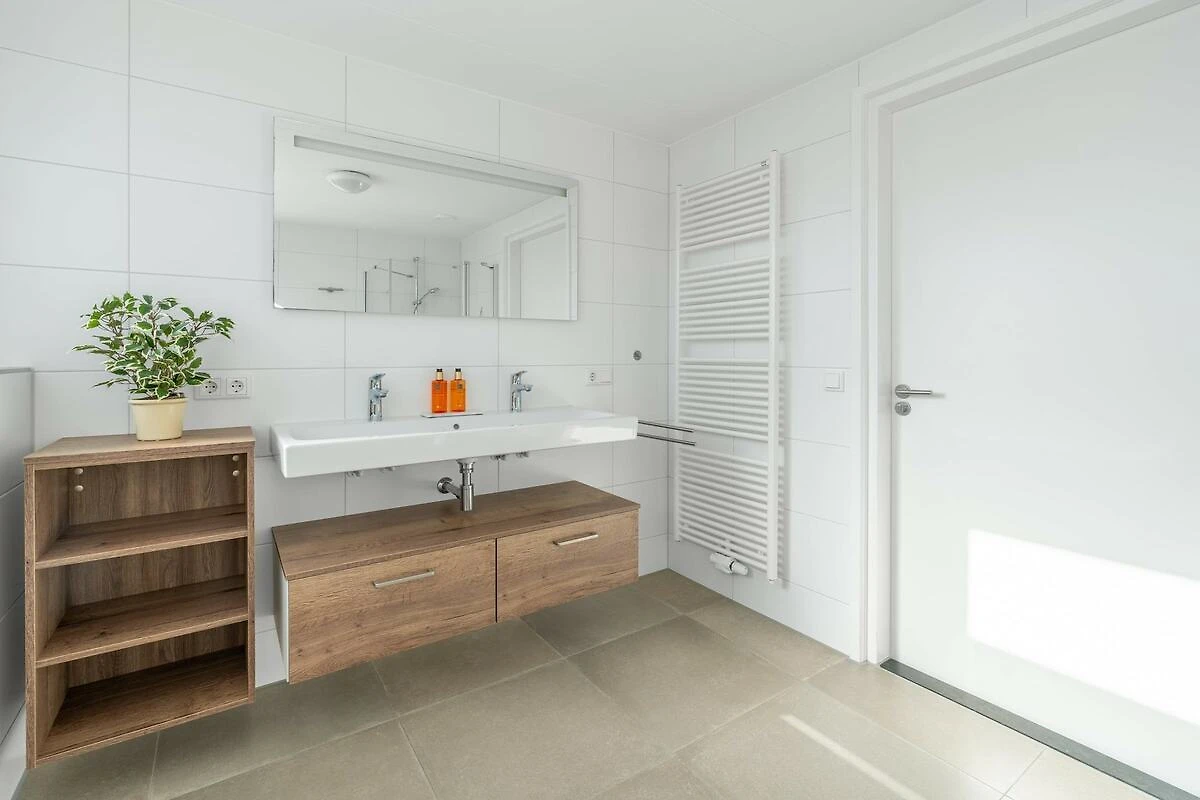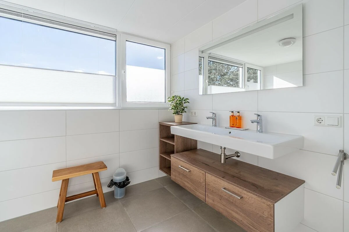 In der 1. Etage: (Schlafzimmer(Einzelbett(Boxspring), Einzelbett(Boxspring), TV), Schlafzimmer(Einzelbett(Boxspring), Einzelbett(Boxspring), TV), Badezimmer(Dusche, Waschbecken, Waschbecken, Toilette))