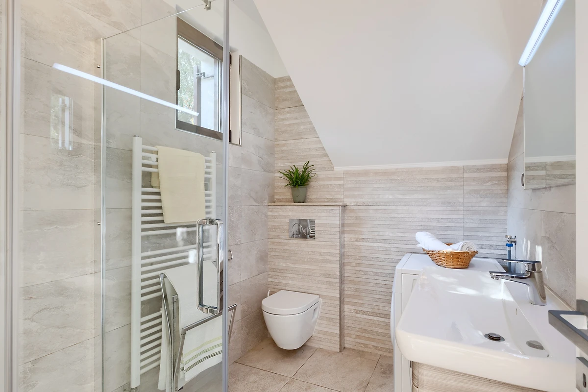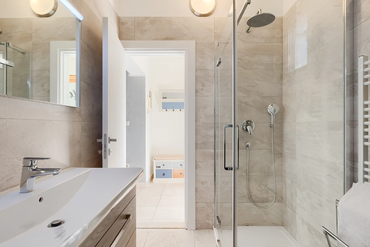 Die Wohnung verfügt über zwei gut ausgestattete Schlafzimmer, darunter ein Queensize-Bett und zwei Einzelbetten, die einen erholsamen Schlaf für alle Gäste gewährleisten. Das Badezimmer mit Dusche bietet bequeme Einrichtungen für jeden.
