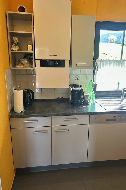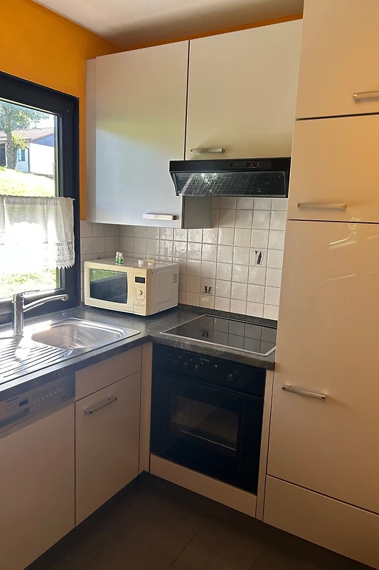 Die voll ausgestattete Kücheneinheit lässt keine Wünsche offen: Mit einem Geschirrspüler, einer Mikrowelle, einer Kaffeemaschine, einem Toaster und einem modernen Herd können Sie hier mühelos köstliche Mahlzeiten zubereiten, während Sie den Blick auf die idyllische Umgebung genießen. Der angrenzende Wohnbereich, ausgestattet mit einem komfortablen Sofa und einem Flachbildfernseher, bietet den idealen Ort für entspannte Abende nach einem erlebnisreichen Tag in der Natur.