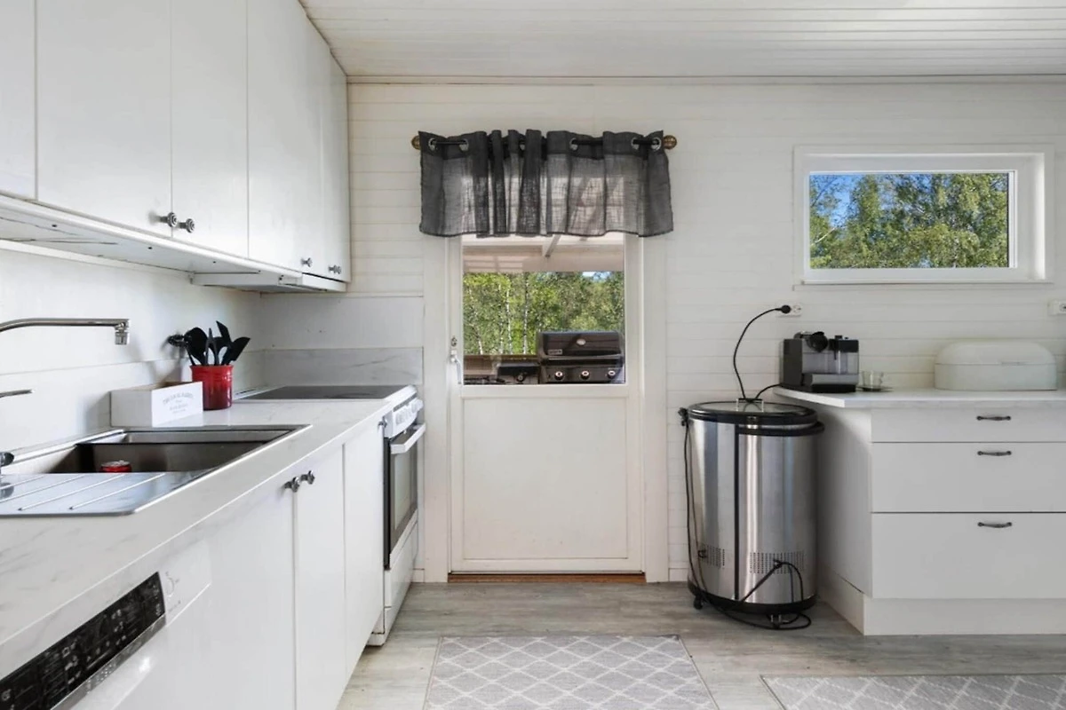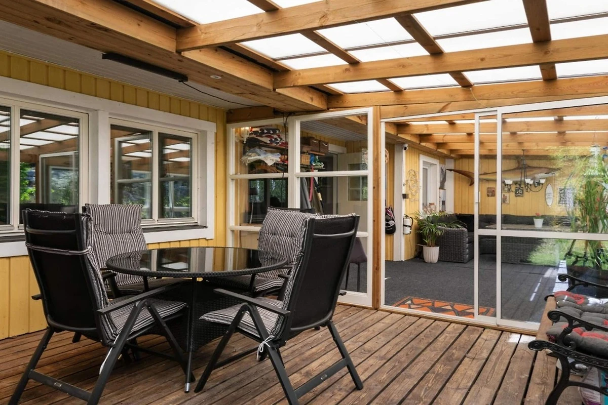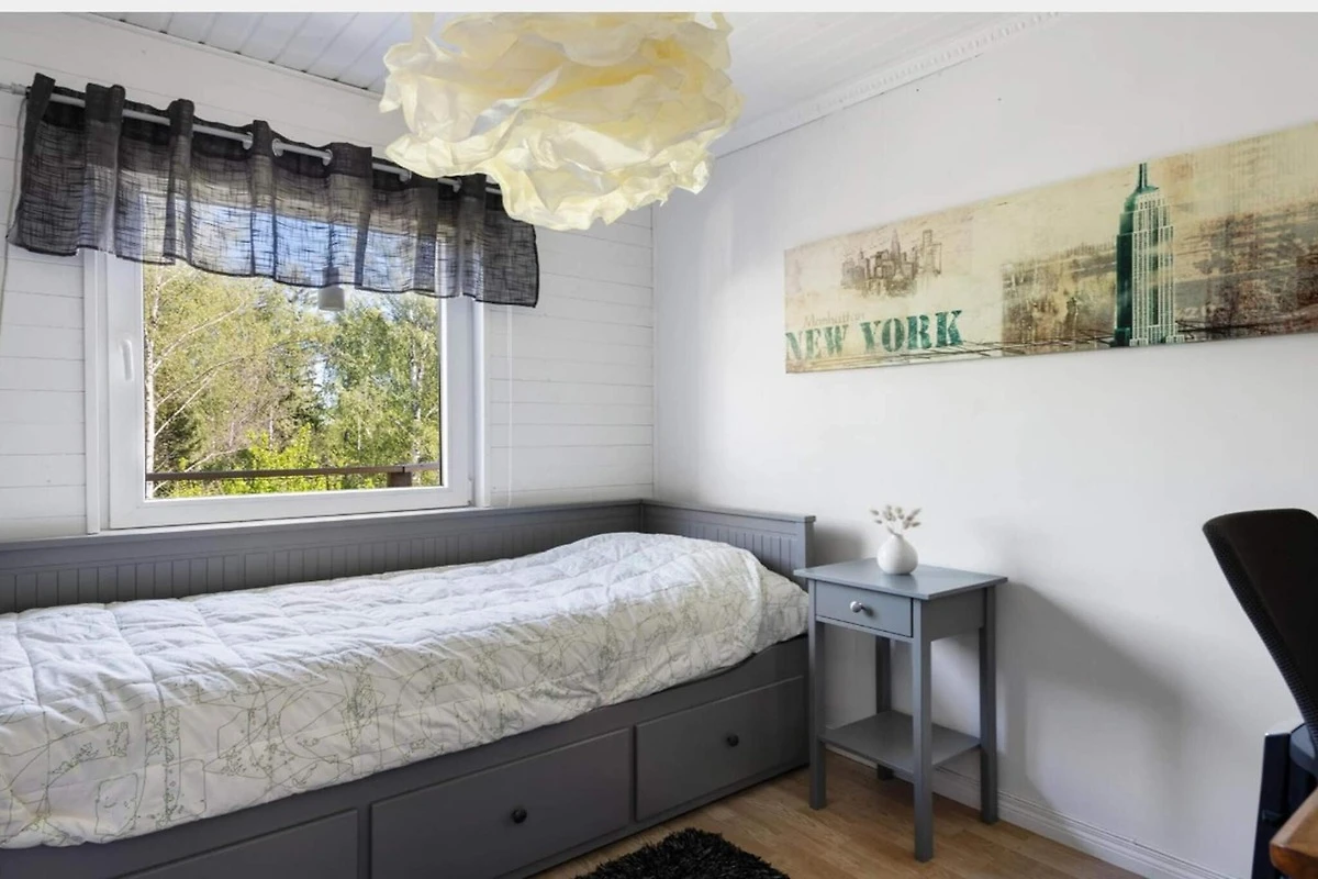 , Küche(Kochherd(elektrisch), Kaffeemaschine, Mikrowelle, Spülmaschine, Kühlschrank, Tiefkühlschrank(60-99L)), Wohn-/Schlafzimmer(TV(schwedische Fernsehsender), Netflix), Schlafzimmer(Doppelbett), Schlafzimmer(Doppelklappbett ), Schlafzimmer(Doppelklappbett ), Badezimmer(Waschbecken, Dusche, Toilette, Waschmaschine), Veranda, Whirlwanne(im Garten, erwärmt, 4 Personen), Gartenmöbel, Gartenmöbel, Gartenmöbel, Parkplatz, Liegestühle, Spielgeräte, Erdwärme, Luft-Luft-Wärmepumpe