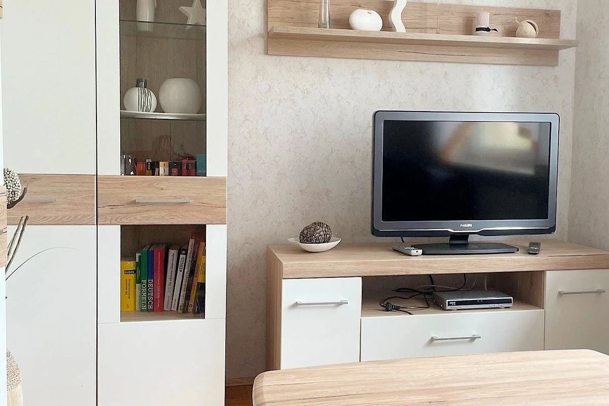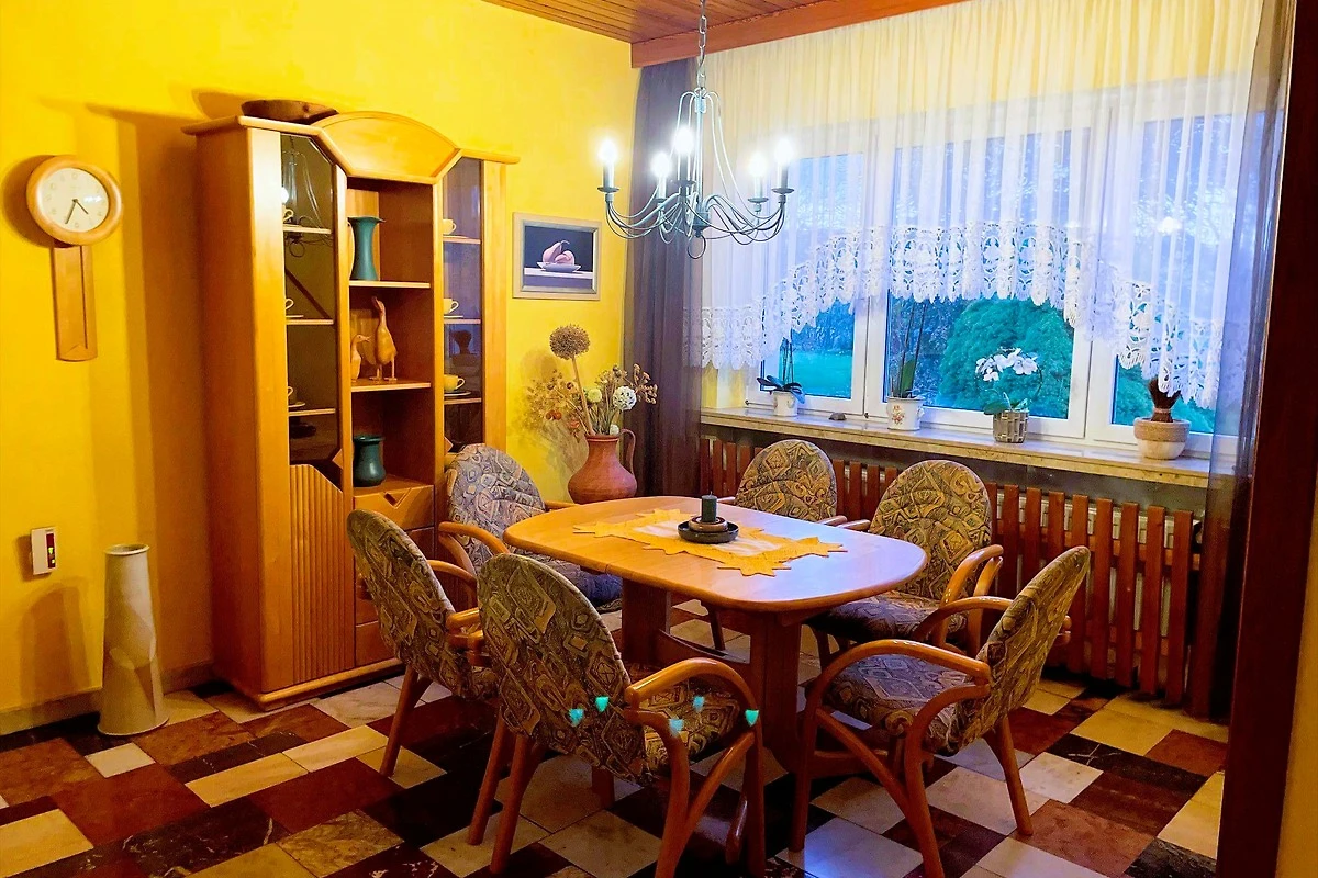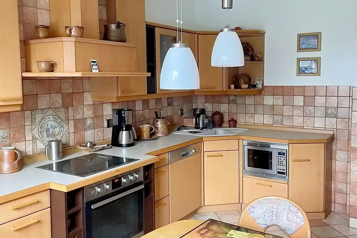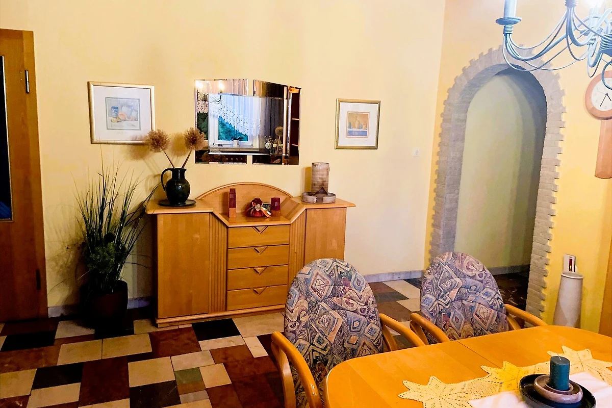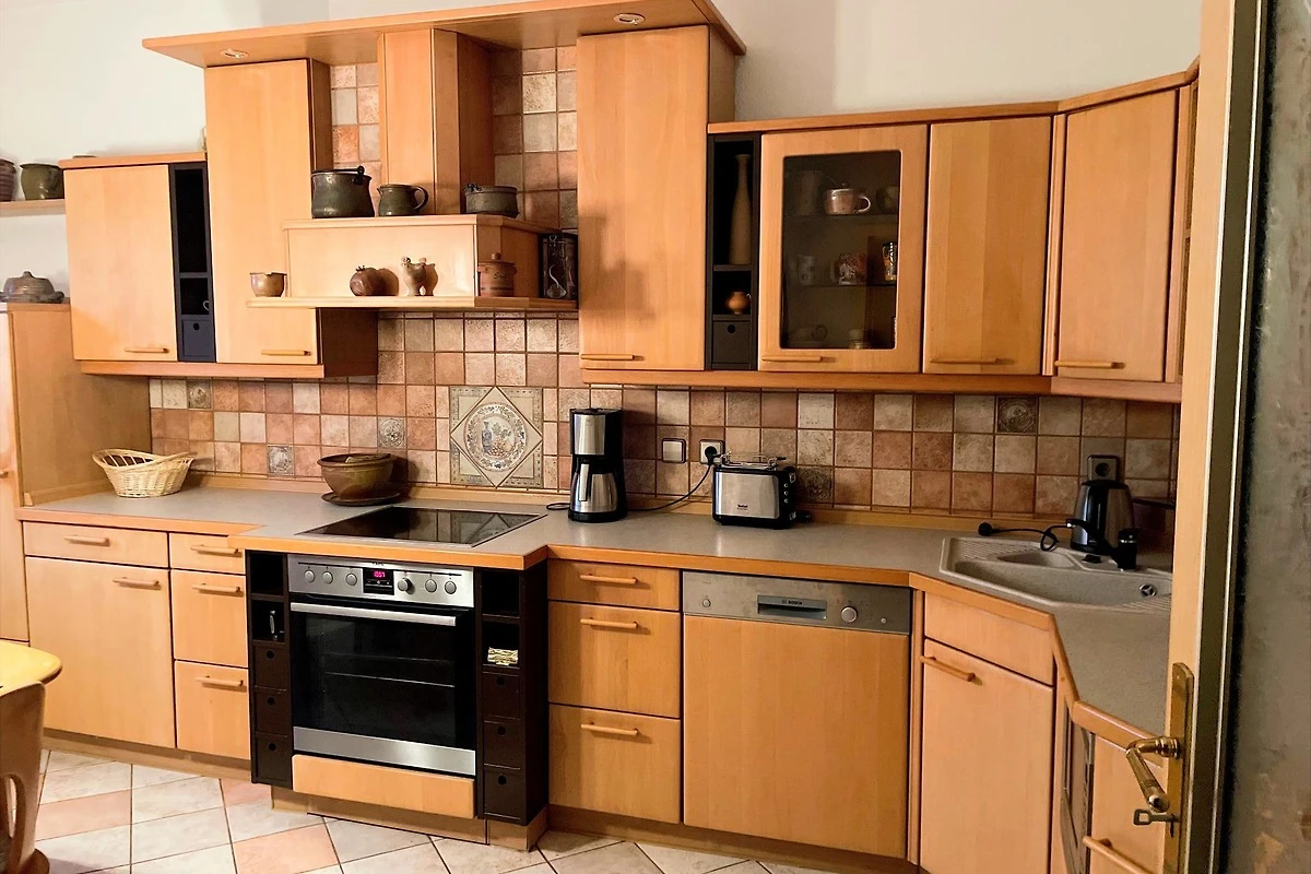 Die Küche ist vollständig ausgestattet und lässt keine Wünsche offen – vom Herd über den Kühlschrank bis zur Geschirrspülmaschine. Hier können Sie kulinarische Köstlichkeiten zubereiten und sich am Esstisch im angrenzenden Esszimmer gemeinsam verwöhnen lassen. Der große Tisch bietet Platz für alle Gäste.