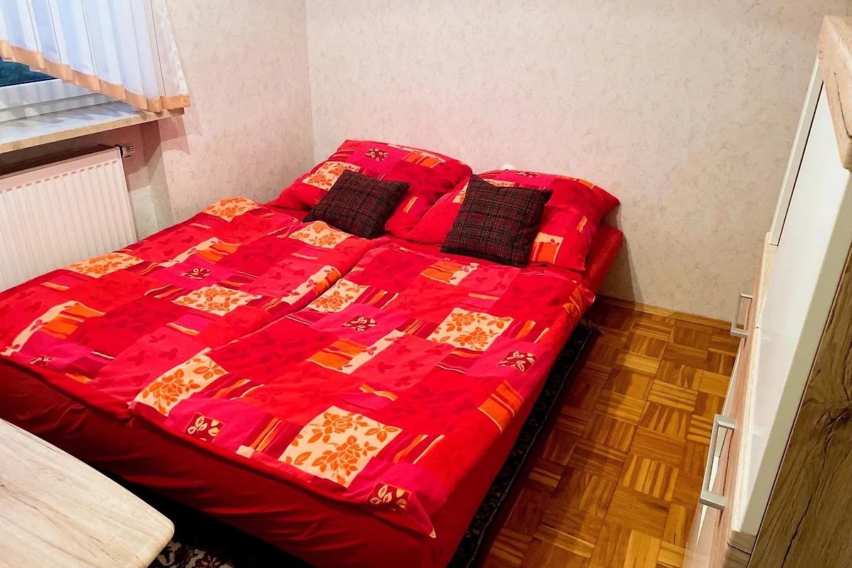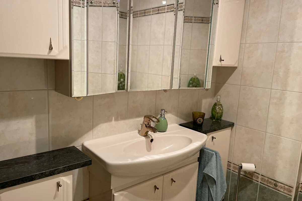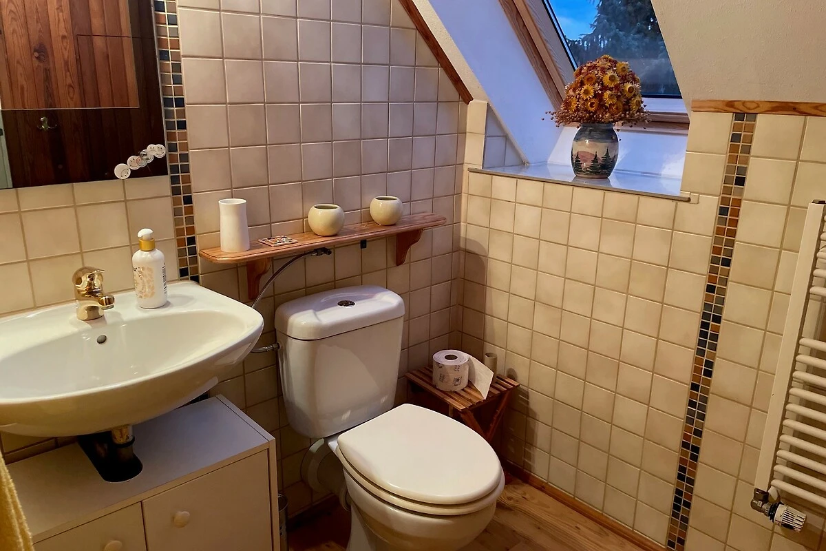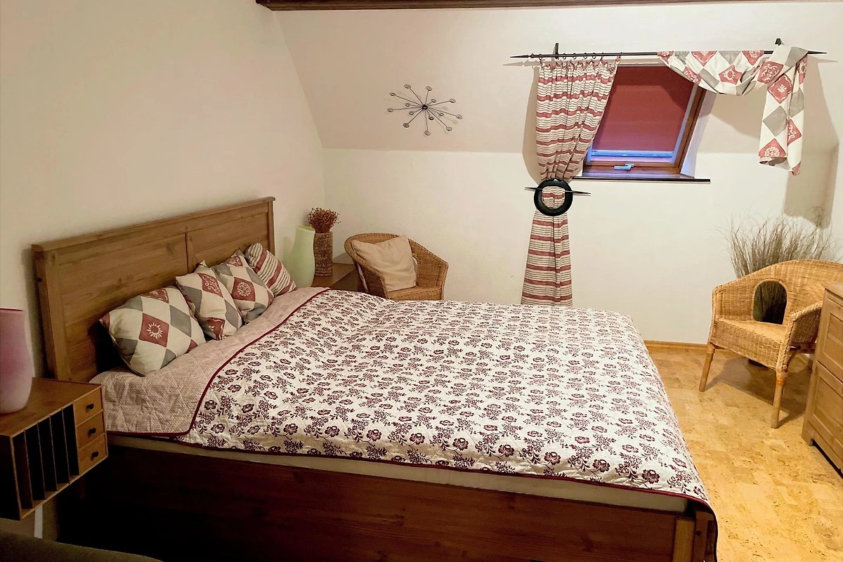 Das Obergeschoss des Hauses bietet ein weiteres Schlafzimmer, das ideal für weitere Gäste oder vielleicht für Kinder ist. Mit seinem charmanten Ambiente und den gemütlichem Doppelbett ist es der perfekte Ort für eine erholsame Nachtruhe. Eine separates WC mit Waschbecken ist hier ebenfalls vorhanden.