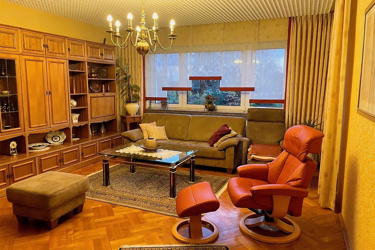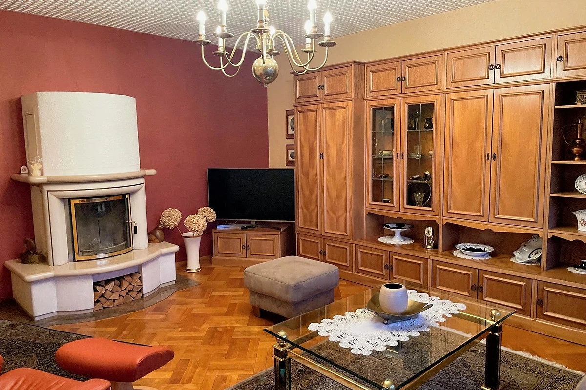 Betreten Sie das Erdgeschoss und lassen Sie sich sofort von der warmen Atmosphäre verzaubern. Das großzügige Wohnzimmer ist das Herzstück des Hauses. Hier finden Sie bequeme Sessel und ein Sofa, die zum Entspannen einladen, sowie einen Kamin, der an kühlen Abenden für wohlige Wärme sorgt. Große Fenster durchfluten den Raum mit Tageslicht.