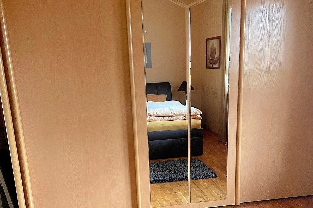 Das Schlafzimmer im Erdgeschoss ist ein Ort der Entspannung. Mit einem komfortablen Doppelbett und großem Kleiderschrank ausgestattet. Das angrenzende Bad ist modern gestaltet und bietet alles, was Sie für Ihre persönliche Pflege benötigen. Genießen Sie ein wohltuendes Bad nach einem ereignisreichen Tag in der Natur.