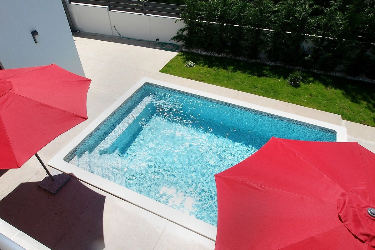 Draussen können Gäste einen privaten 5x5 Meter grossen Swimmingpool geniessen, der perfekt für erfrischende Abkühlung ist. Das 500 m² grosse Grundstück umfasst einen wunderschönen Garten mit Gartenmöbeln und einem Grillbereich, ideal zum Essen im Freien und zur Entspannung. Privater Aussenparkplatz für 2 Fahrzeuge ist vor Ort verfügbar.