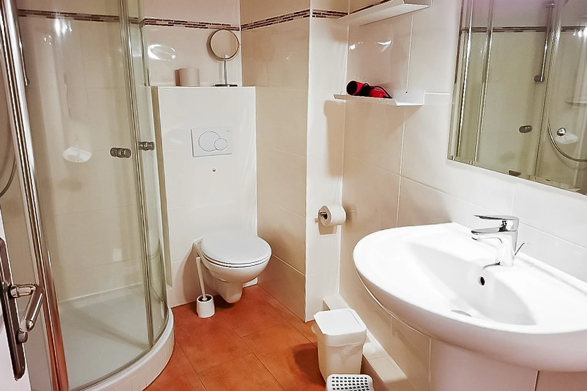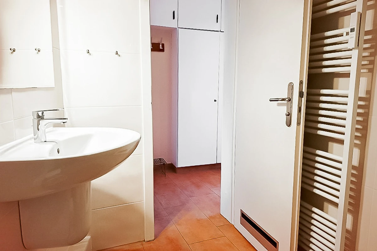 Das Badezimmer verfügt über Dusche, Waschbecken und Handtuchheizkörper. Ein Föhn ist vorhanden.