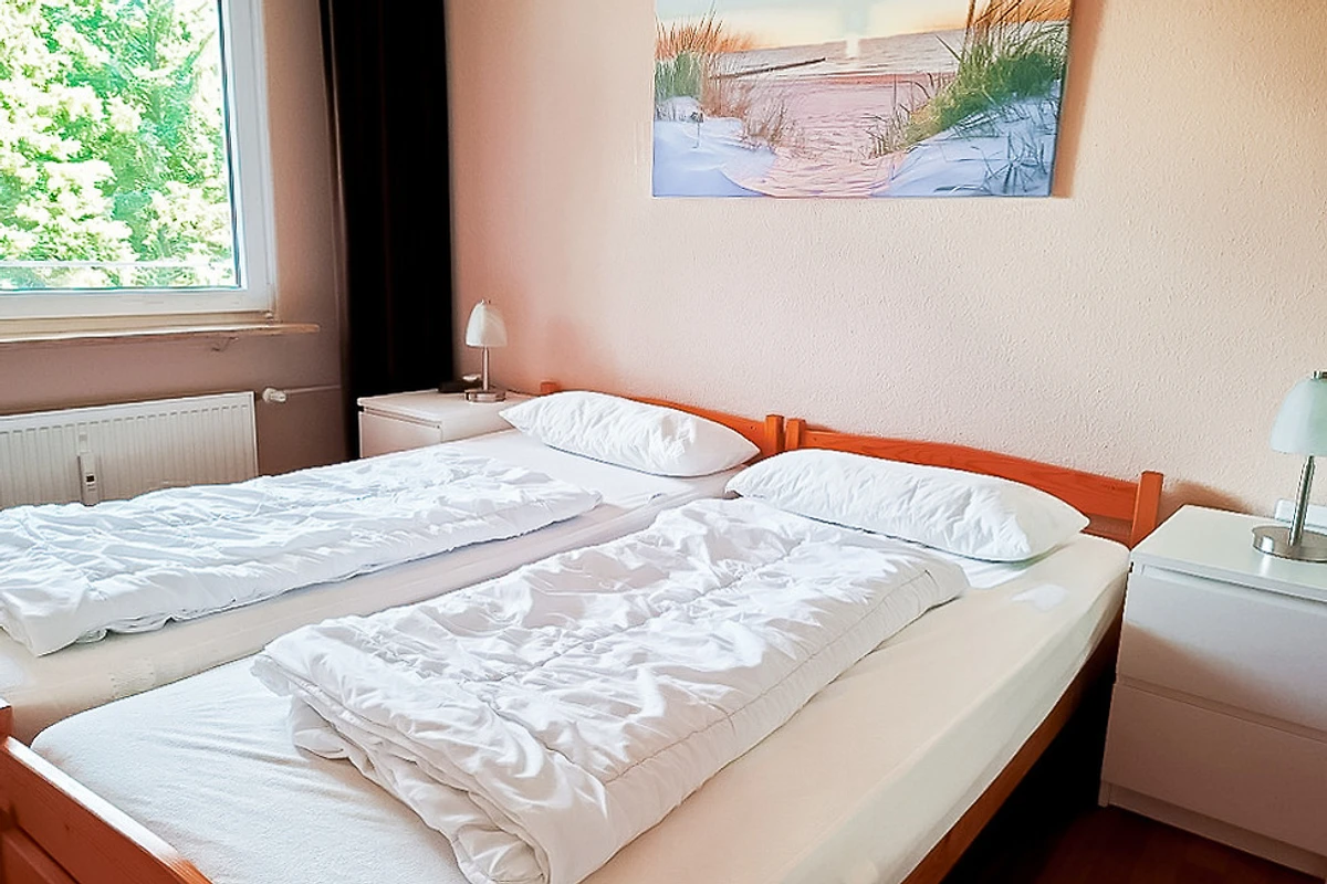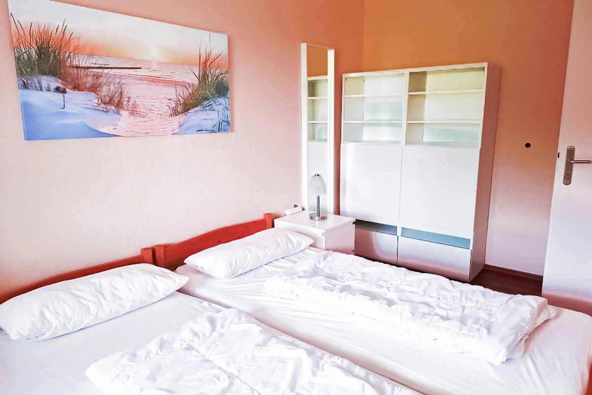 Im Schlafzimmer befinden sich 2 Einzelbetten (90x200cm) und eine Schrankkombination für Wäsche. Ein separater Schrank enthält Staubsauger und Zubehör. Das Schlafzimmer lässt sich angenehm verdunkeln.