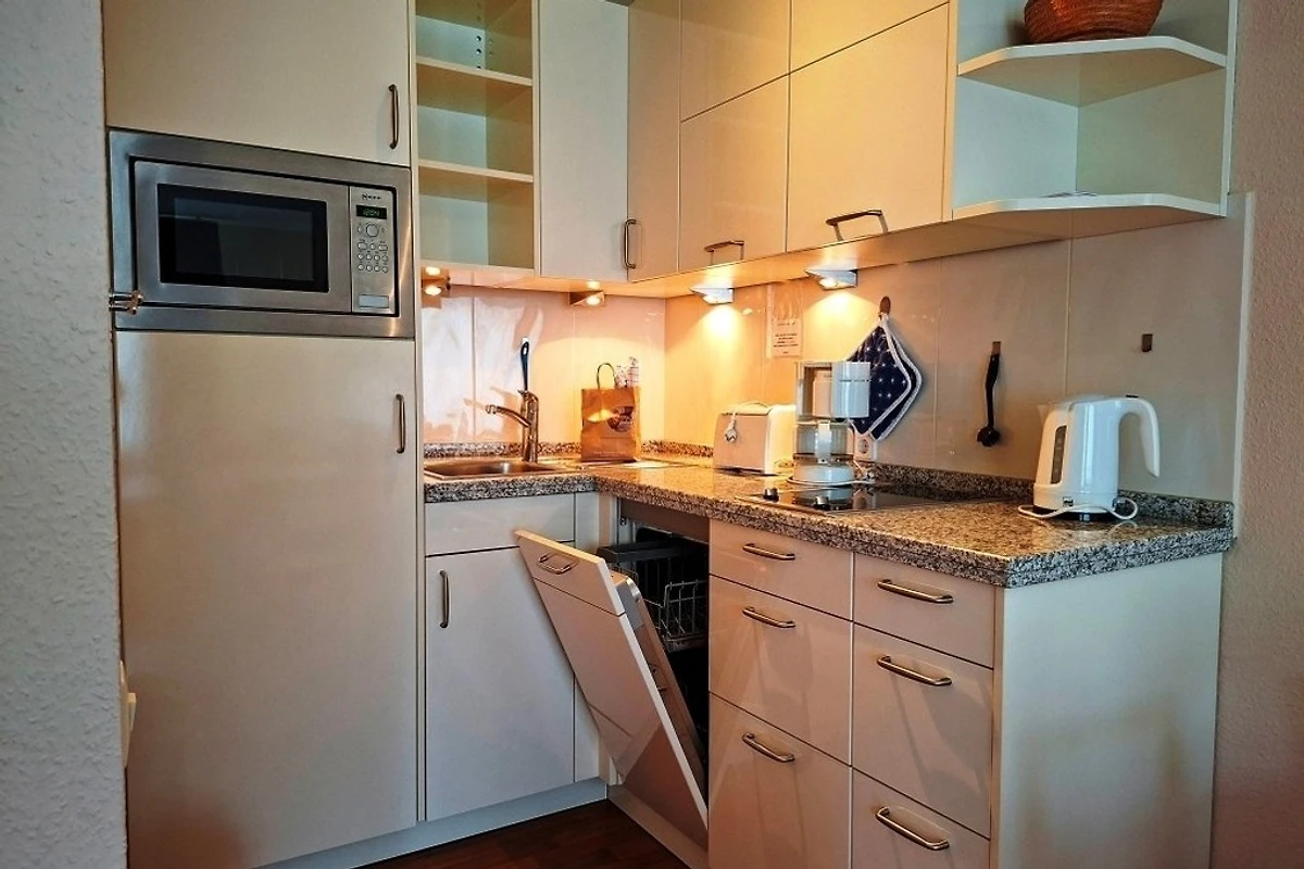 Der Essplatz schliesst nahtlos an die offen gestaltete Einbauküche an. Die ist ausgestattet mit 2 Induktionsfeldern, Geschirrspüler, Kühlschrank mit Gefrierfach, Mikrowelle mit Grillfunktion und gut sortierten Kochutensilien. Kaffeemaschine, Toaster, Einhandmixer und Wasserkocher sind ebenfalls vorhanden.