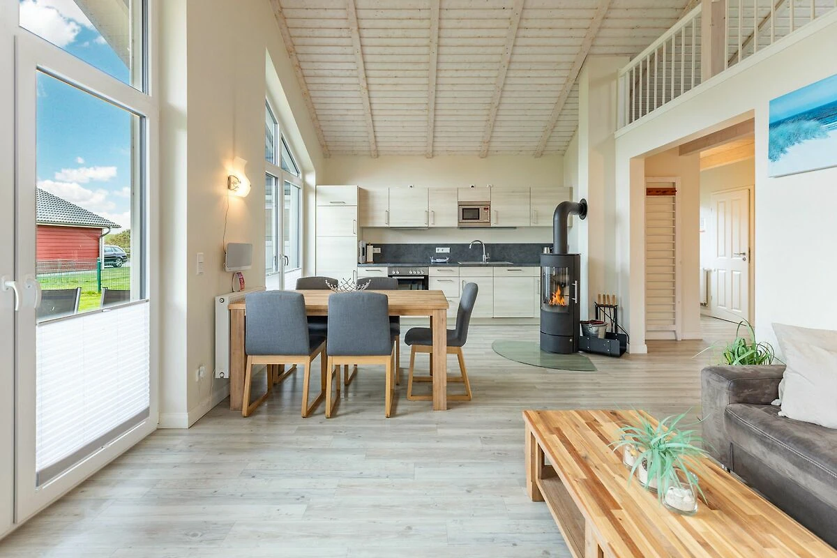 Das gemütliche Wohnzimmer ist mit einem SAT-TV ausgestattet. Der Kaminofen sorgt auch in der kälteren Jahreszeit für behagliche Stunden. Die offene Küche bietet Ihnen eine exklusive und umfangreiche Ausstattung, die das Herz eines jeden Hobbykochs höher schlagen lässt: Ceranfeld mit 4 Kochplatten, Backofen, Kühlschrank mit ***Gefrierfach, Mikrowelle, Geschirrspüler, Filterkaffeemaschine uvm. Das Badezimmer lässt keine Wünsche offen: zwei Waschbecken, eine große Badewanne, eine ebenerdige Dusche und eine schöne Sauna geben Ihrem Urlaub den richtigen Rahmen. Das Ferienhaus verfügt über ein zusätzliches WC. Auf der überdachten Terrasse können Sie auf bequemen Gartenstühlen und -liegen die Sonne genießen. In den Monaten von April bis Oktober steht Ihnen zusätzlich ein Strandkorb zur Verfügung.