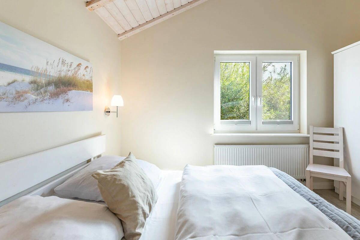Das 80 qm große Ferienhaus ist modern und exklusiv im skandinavischen Charme eingerichtet. Die zwei Schlafzimmer mit jeweils einen Komfort-Doppelbett (180 x 200 cm) bieten Platz für bis zu vier Personen. Die Schlafzimmer sind mit Fliegengittern ausgestattet.