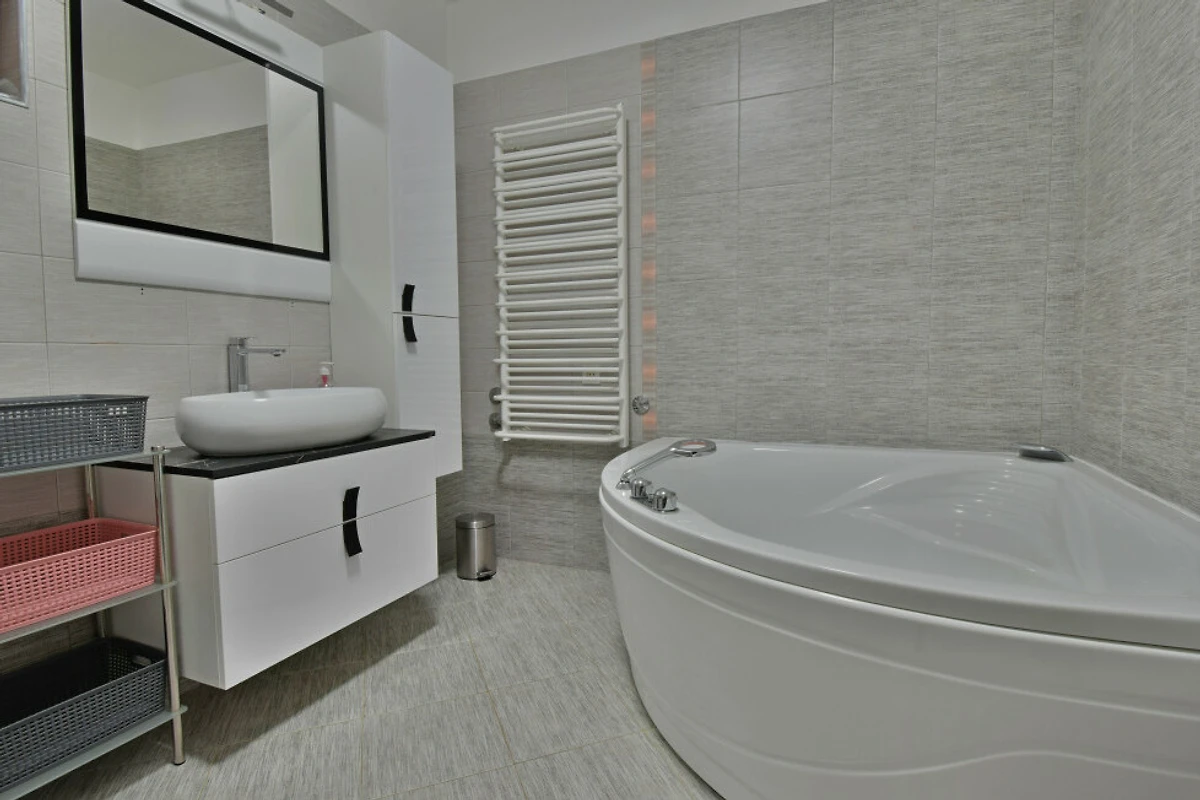 Die Wohnung verfügt über zwei komfortable Schlafzimmer mit Queensize-Betten, die ausreichend Platz und Komfort für bis zu 4 Gäste bieten. Zwei wunderschön eingerichtete Badezimmer - eines mit Dusche und ein anderes mit Badewanne - sorgen für Bequemlichkeit und Entspannung für alle Bewohner.