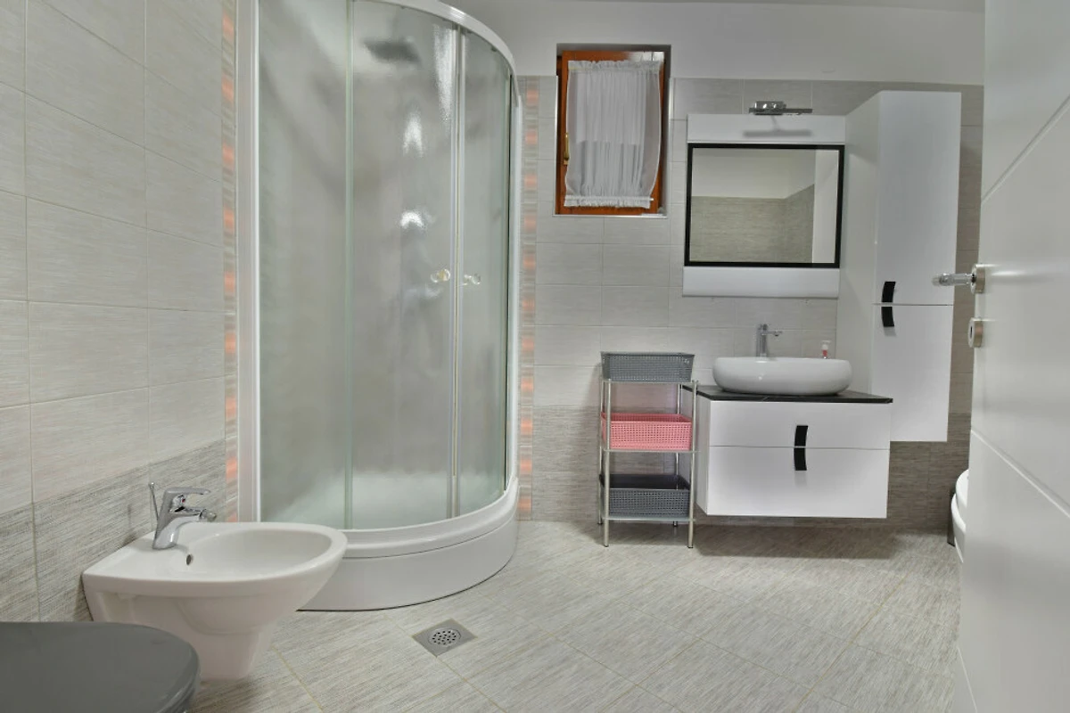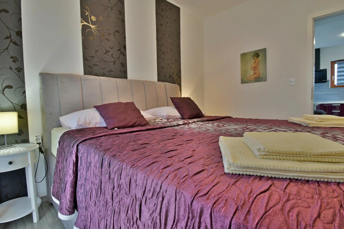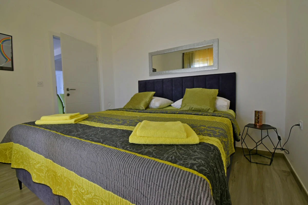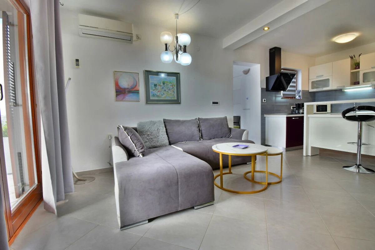 Zusätzliche Annehmlichkeiten umfassen Klimaanlage, WLAN, Satellitenfernsehen und ein Bügeleisen. Privater Aussenparkplatz für zwei Fahrzeuge ist direkt auf dem Grundstück verfügbar. Die Wohnung liegt nur 1,5 km von einem Sandstrand entfernt und ist in der Nähe der Stadt Karlobag und eines Supermarktes.