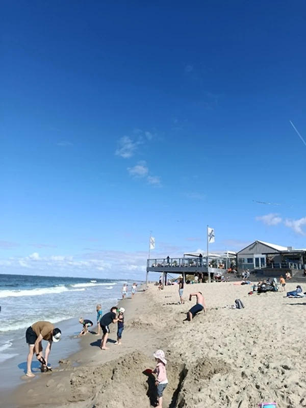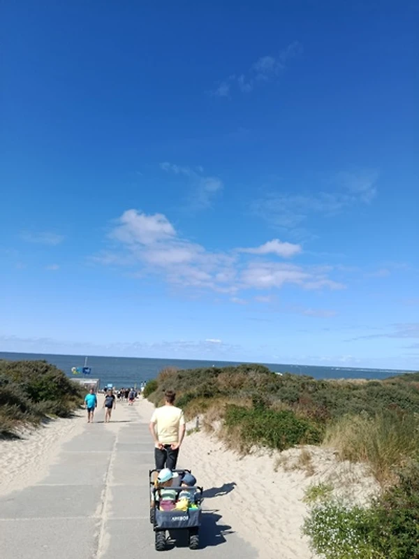 Nach nur 850m erreicht ihr den langen Sandstrand, für das Gepäck steht euch unser Bollerwagen zur Verfügung.