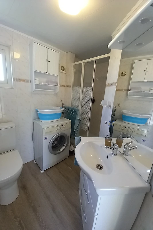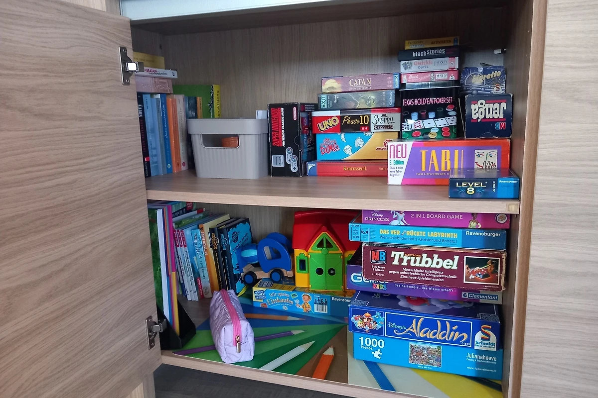 Für Familien mit kleinen Kindern sind ein Babybett, ein Rausfallschutz, ein Hochstuhl und vieles mehr vorhanden. Im geräumigen Badezimmer findet ihr außerdem einen Fön und eine Waschmaschine.