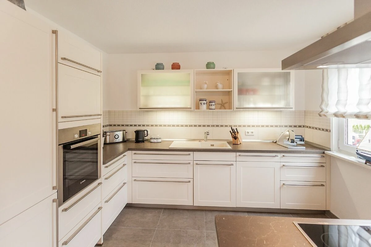 KÜCHE // offene Küche mit Kochinsel und Sitztresen, Induktionsherd, Mikrowelle, Spülmaschine, Kühlschrank, Backofen, Toaster, Wasserkocher, Kaffeemaschine, reichlich Besteck, Geschirr und Küchenutensilien ++