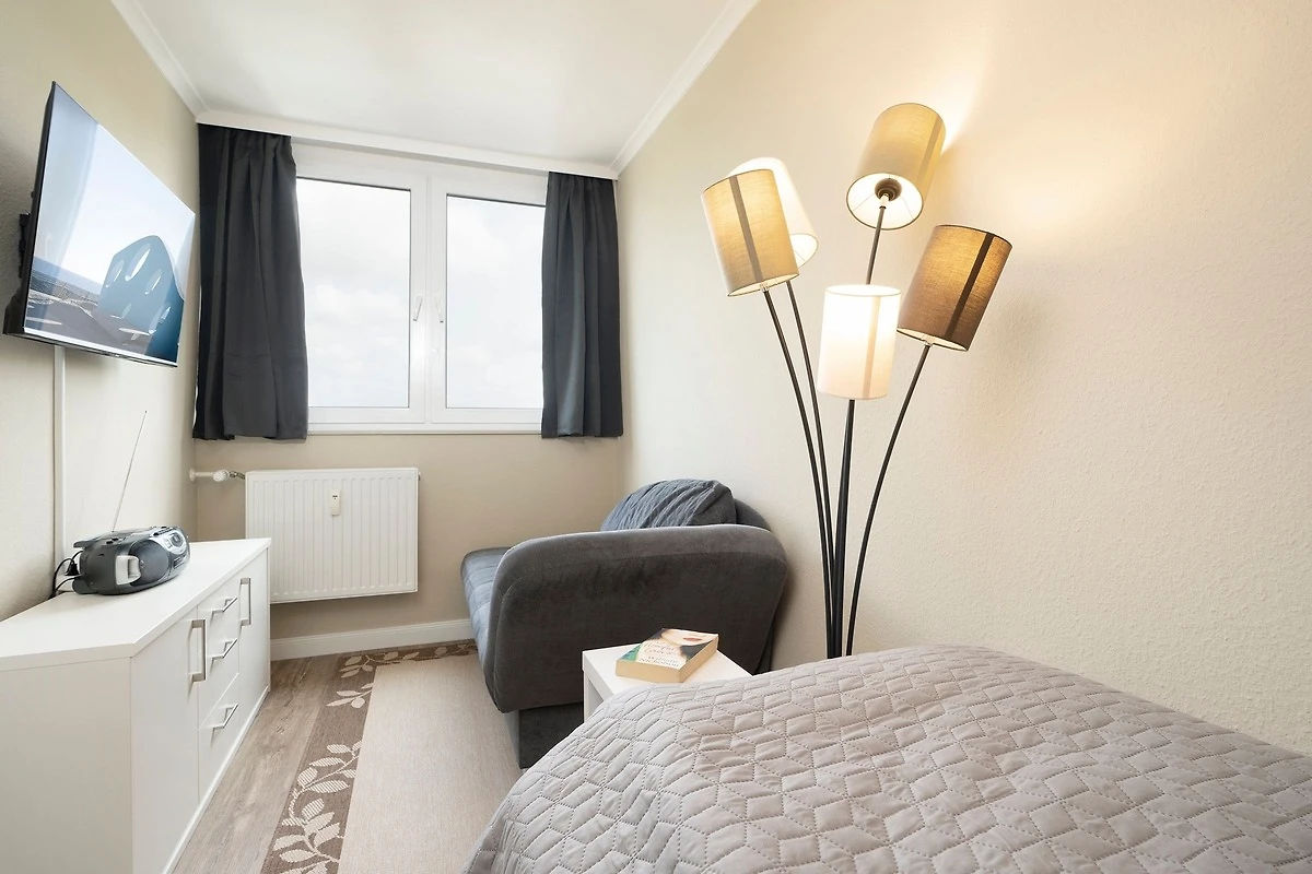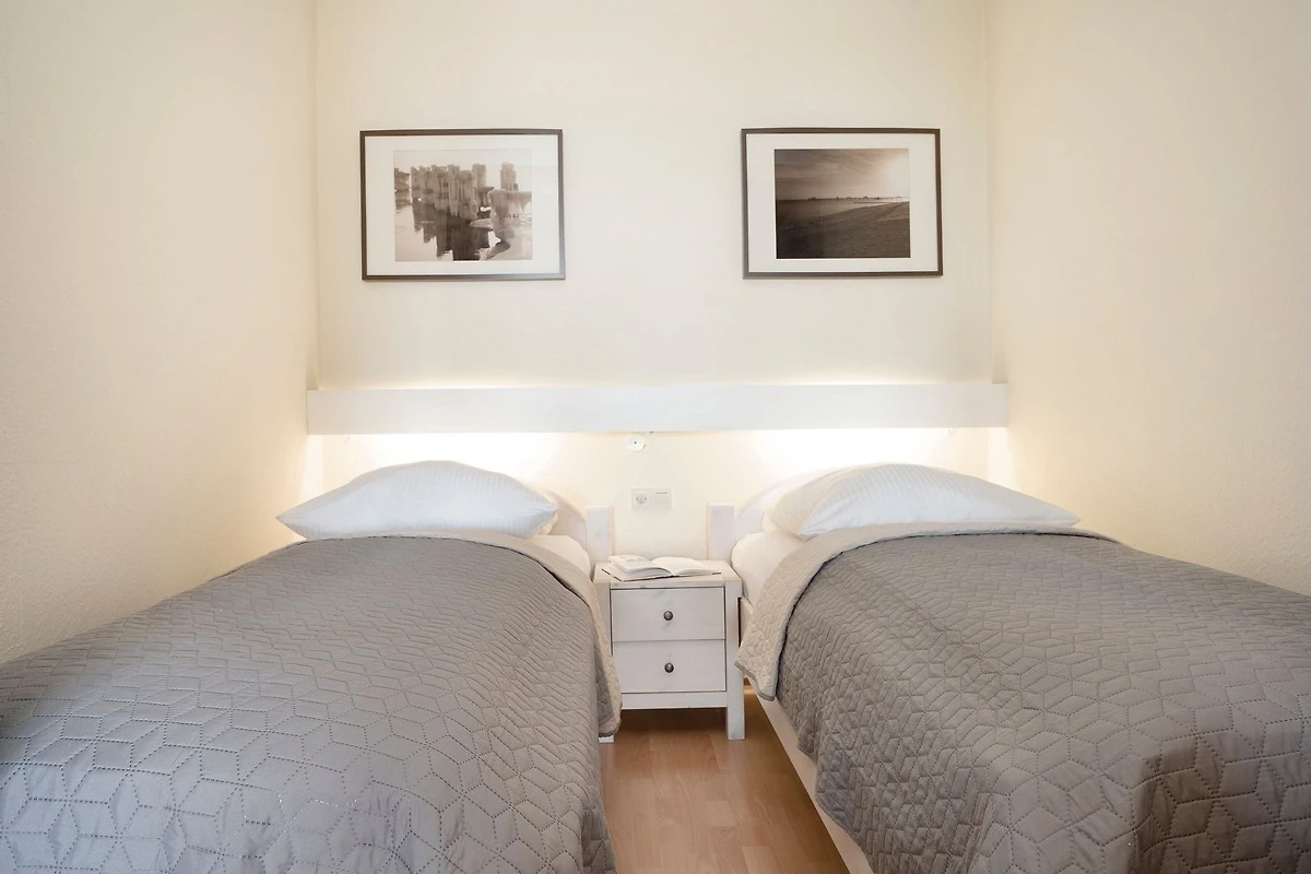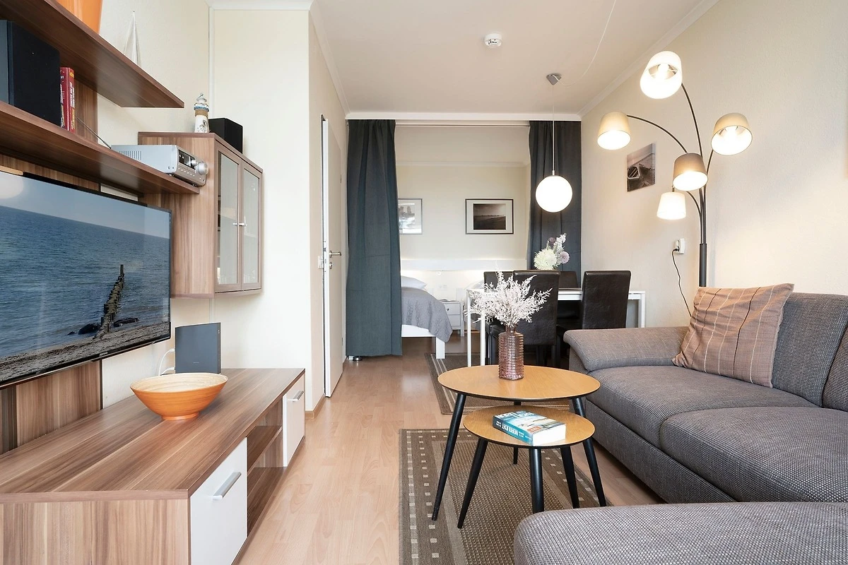Diese strandnahe Ferienwohnung bietet Ihnen ein Wohn-/Schlafzimmer mit gemütlicher Couch und 2 getrennt stehenden Betten (je 90x200 cm) in Komforthöhe, die optisch durch einen Vorhang abgetrennt werden können. Ein Smart-TV sowie eine Micro-Hifi-Anlage mit Internet-Radio und CD-Spieler sorgen für ausreichend Unterhaltung. Die Küche ist mit einem Geschirrspüler gut ausgestattet. Das separate Schlafzimmer verfügt über ein Boxspringbett (90x200 cm) und eine ausklappbare Recamière als zusätzliche Schlafgelegenheit (ca. 80x200 cm, als Empfehlung für Kinder bis max. 14 Jahre geeignet) sowie einen weiteren Smart-TV. Im modernen Bad (Dusche ca. 70x80 cm) starten Sie erfrischt in den neuen Urlaubstag.