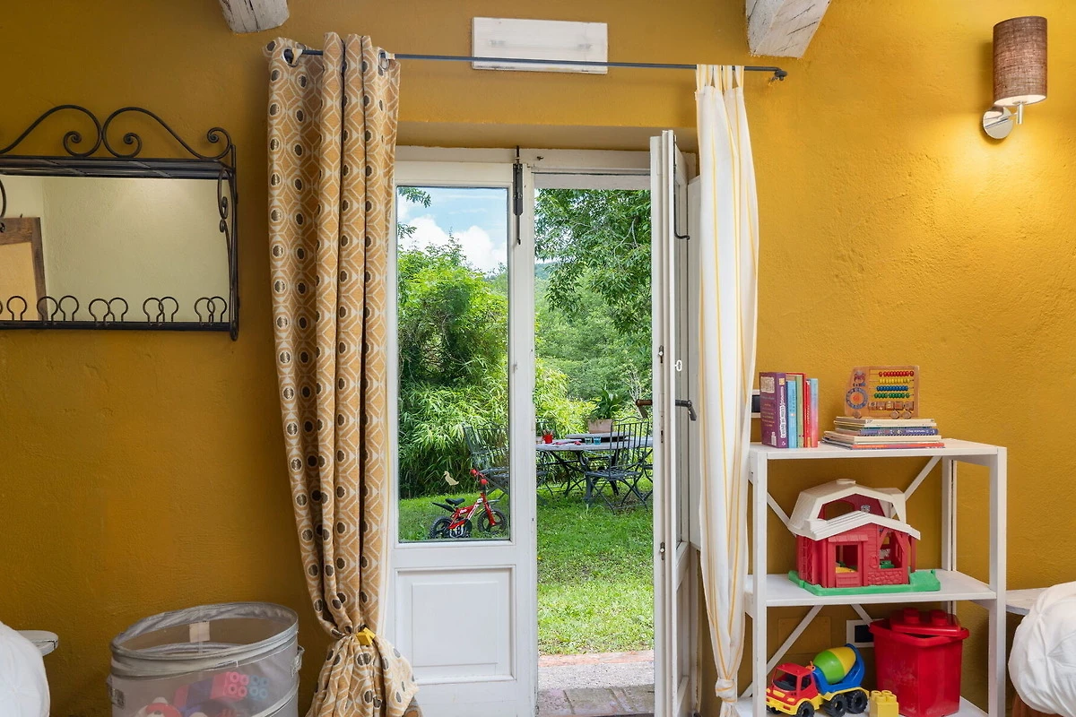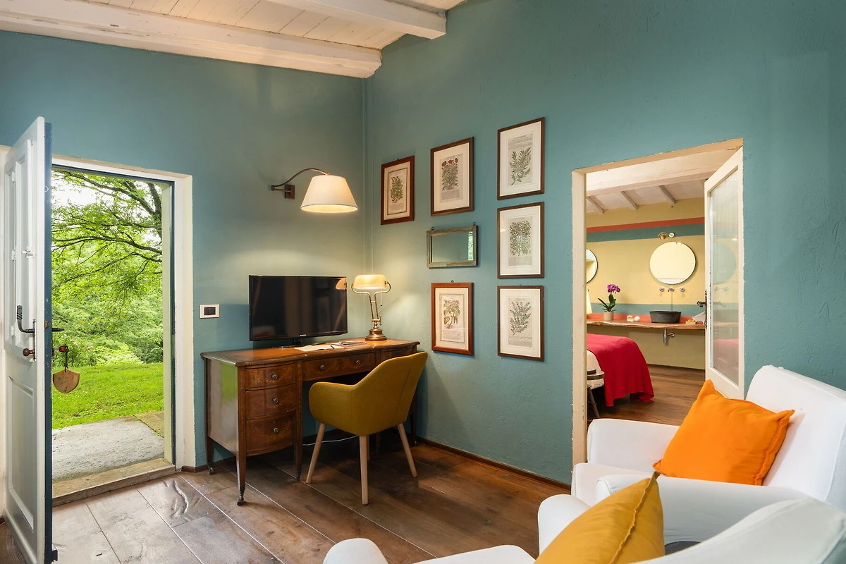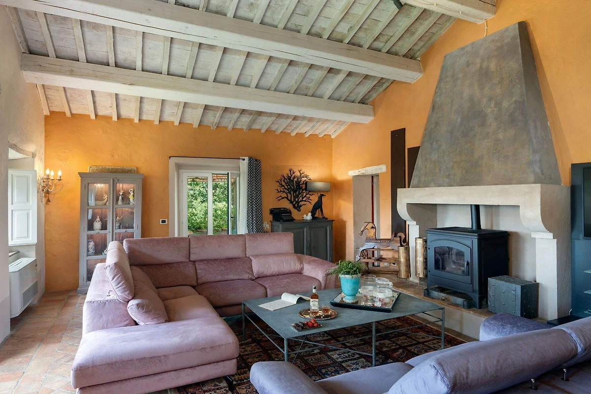 Im ersten Stock befindet sich ein Wohnzimmer mit Blick auf die Terrasse. Hier können sich die Gäste auf den bequemen Sofas entspannen, ein Buch lesen oder fernsehen. Das Wohnzimmer ist mit Designermöbeln und feinen Details ausgestattet, die den neu interpretierten toskanischen Stil der Villa widerspiegeln.