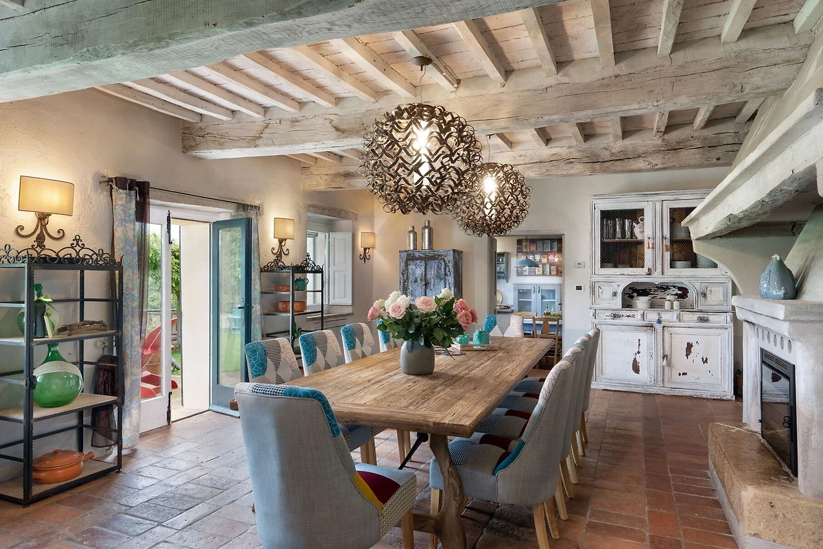 Angrenzend an die Küche befindet sich ein grosses und helles Esszimmer, das sorgfältig eingerichtet wurde, um eine komfortable und einladende Atmosphäre zu schaffen.