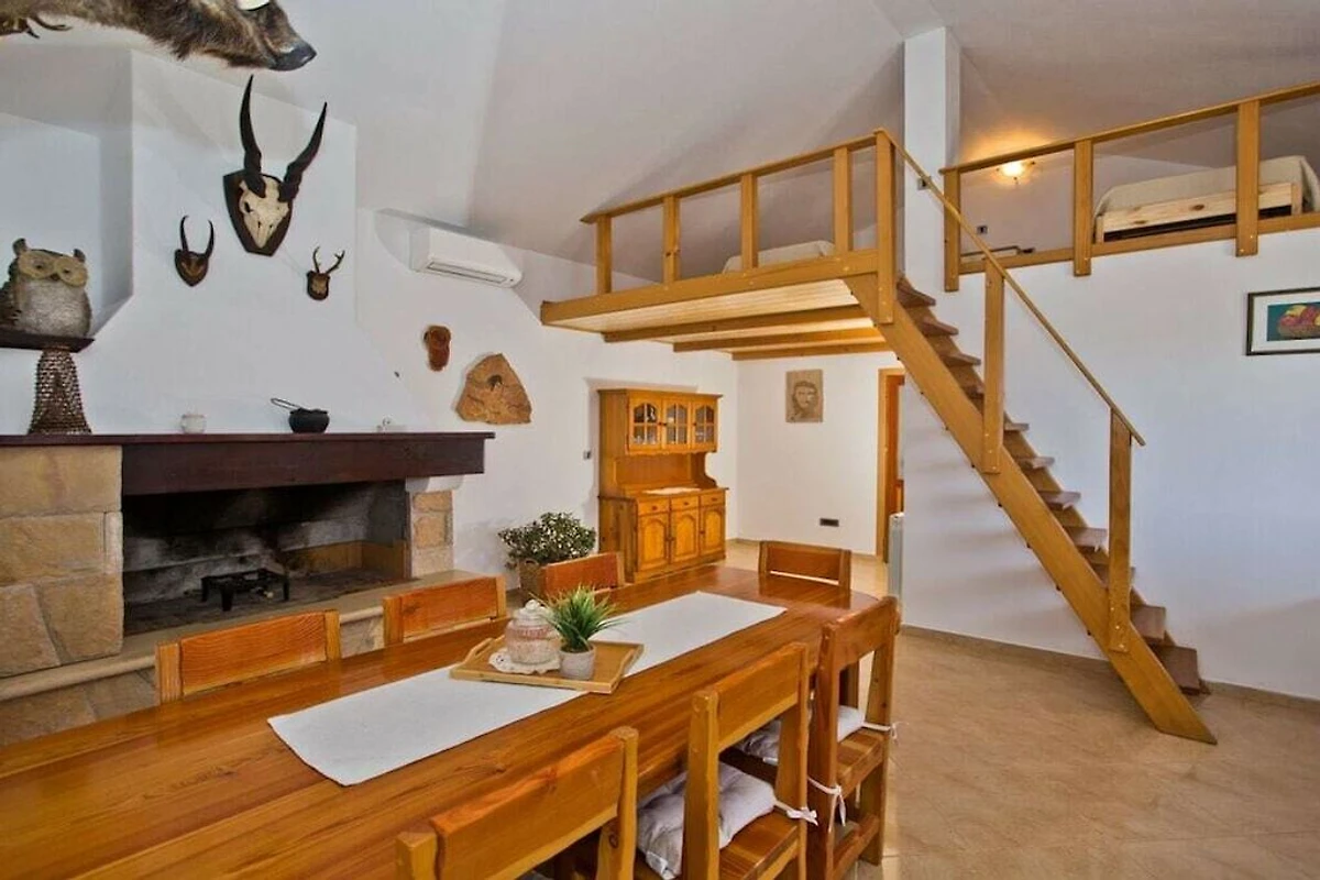 Im Erdgeschoss des größeren zentralen Hauses befindet sich eine voll ausgestattete Küche, ein Esszimmer und ein Wohnzimmer mit Ecksofa, TV / SAT und Kamin und eine Treppe, die rechts nach oben zu zwei großen Schlafzimmern mit Tv / Sat und Ausgang zum Balkon führen. Im kleineren Haus, das mit Jagdtrophäen dekoriert ist, gibt es einen internen großen Kamin aus antikem Holz, ein Esszimmer für 10 Personen, eine Küche, ein Badezimmer mit Dusche und eine Holztreppe, die zur Galerie mit zwei Betten führen. Das ganze Haus ist klimatisiert und verfügt über WLAN.