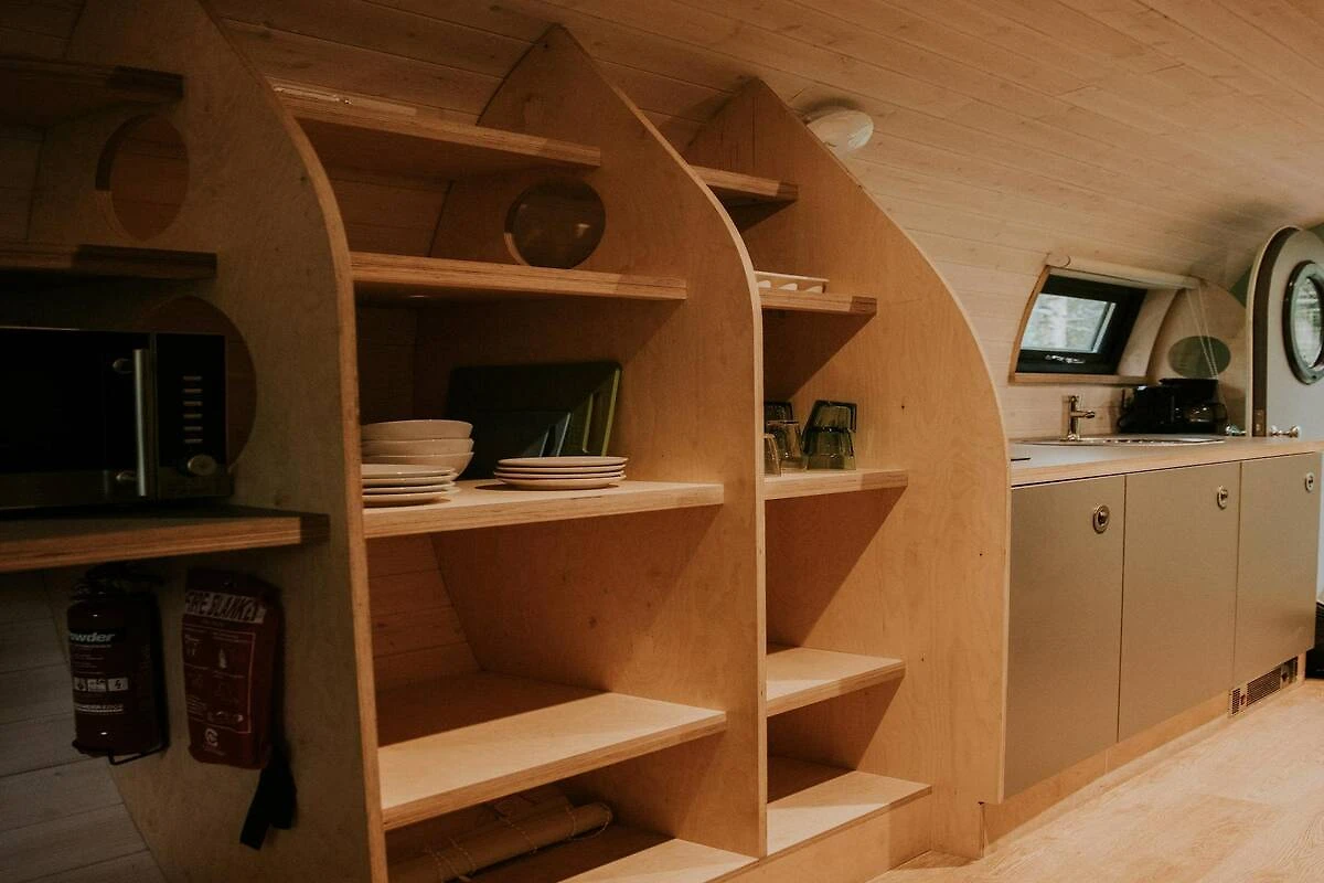 In der Skycabin erwartet Sie ein kompakter und durchdachter Raum, in dem Schlafen, Wohnen und Kochen vereint sind. Die Hütte verfügt über ein gemütliches Etagenbett, eine Sitzecke, die sich in ein Doppelbett umwandeln lässt, und eine gut ausgestattete Küche mit Kühlschrank, Herd, Kombi-Mikrowelle und Kaffeemaschine. Durch das runde Panoramafenster genießen Sie einen ruhigen Blick auf den Wald. Das Badezimmer ist mit Dusche, WC und Waschbecken ausgestattet.