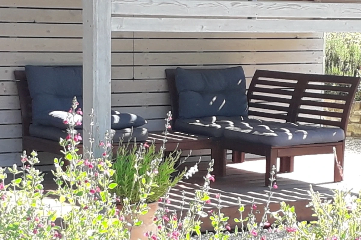 Schattiger und überdachter Sitzplatz mit Grill und Essplatz beim Haus.