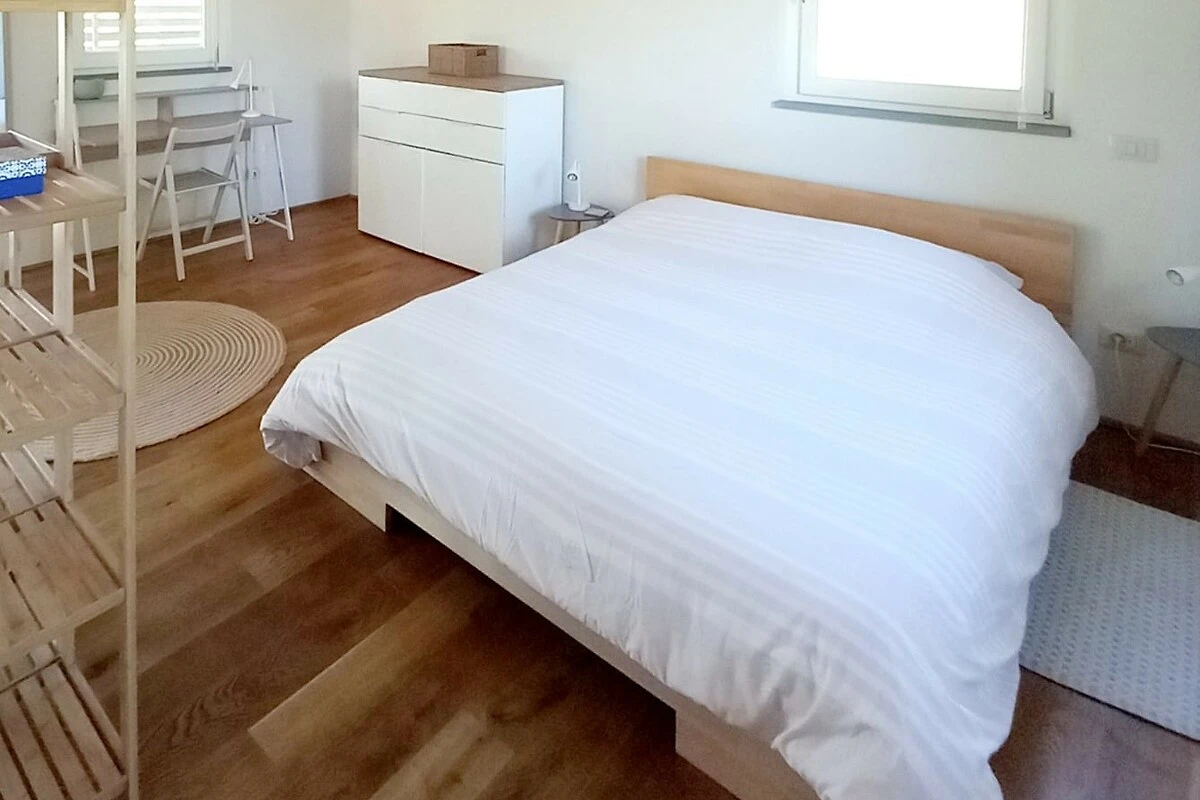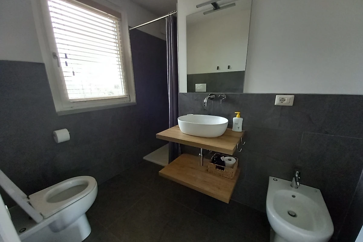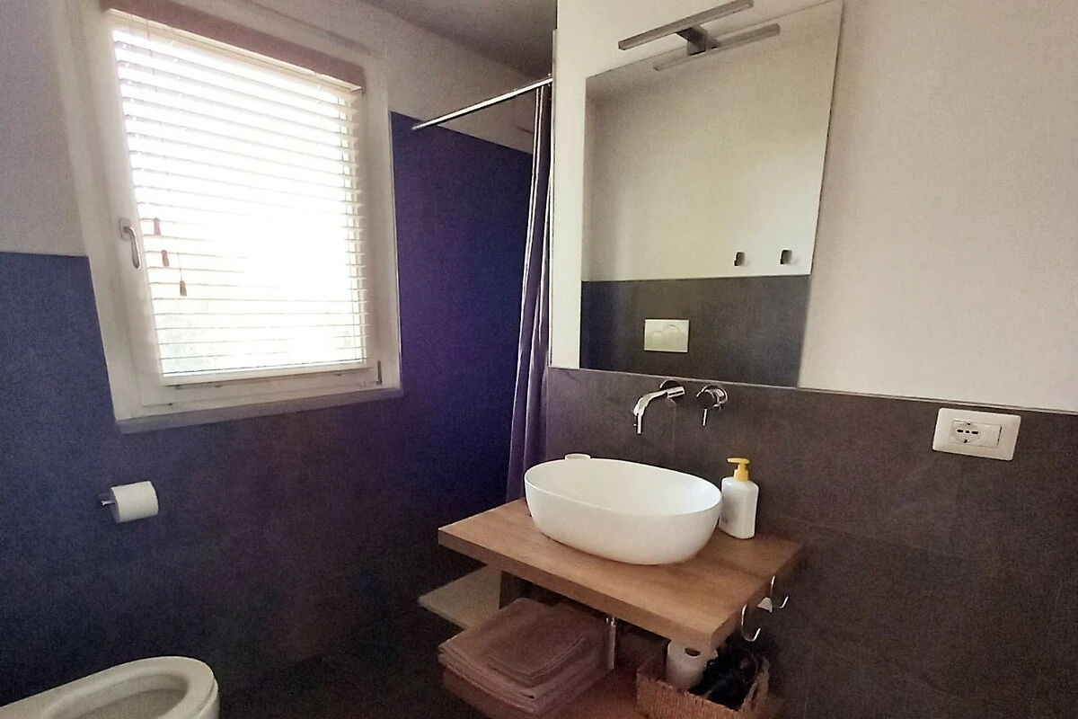 Es gibt ein Doppelbett (160 x 200 cm), eine voll ausgestattete Küche, ein Badezimmer mit WC, Waschbecken, Bidet und ebenerdiger Dusche,