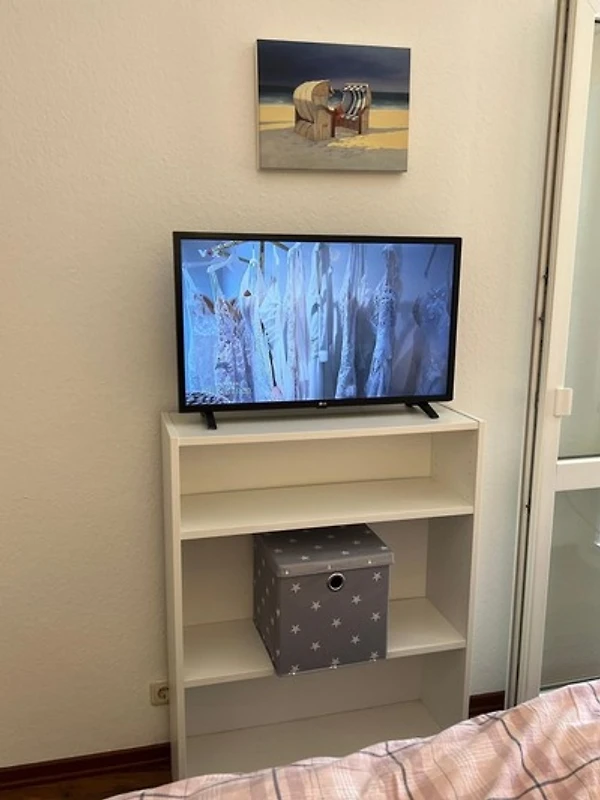 Vom Flur aus erreichen Sie das Schlafzimmer, welches mit einem Boxspringbett und einem durchgehenden Topper von 180 x 200 Meter ausgestattet ist, einen Kleiderschrank und einen Fernseher.