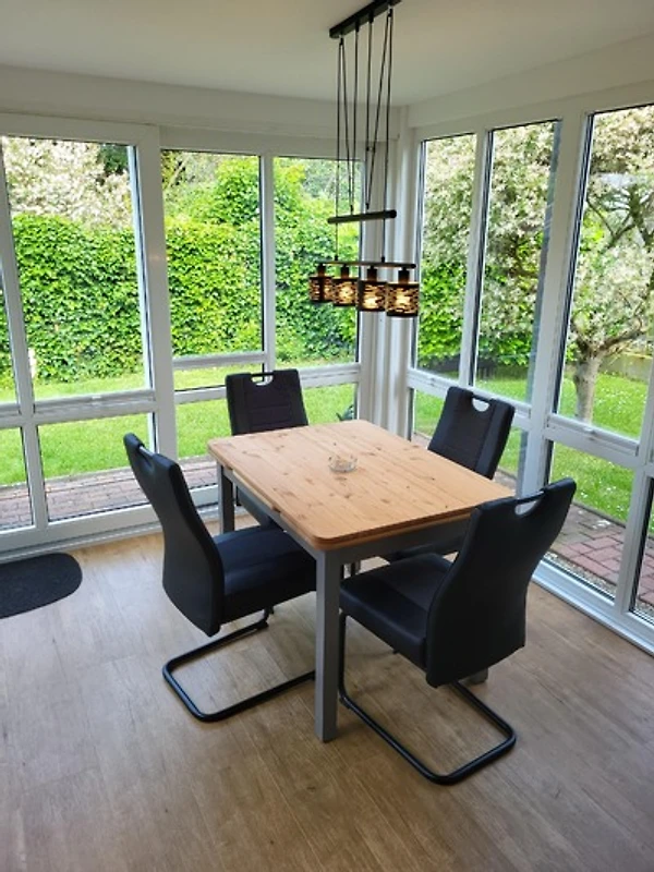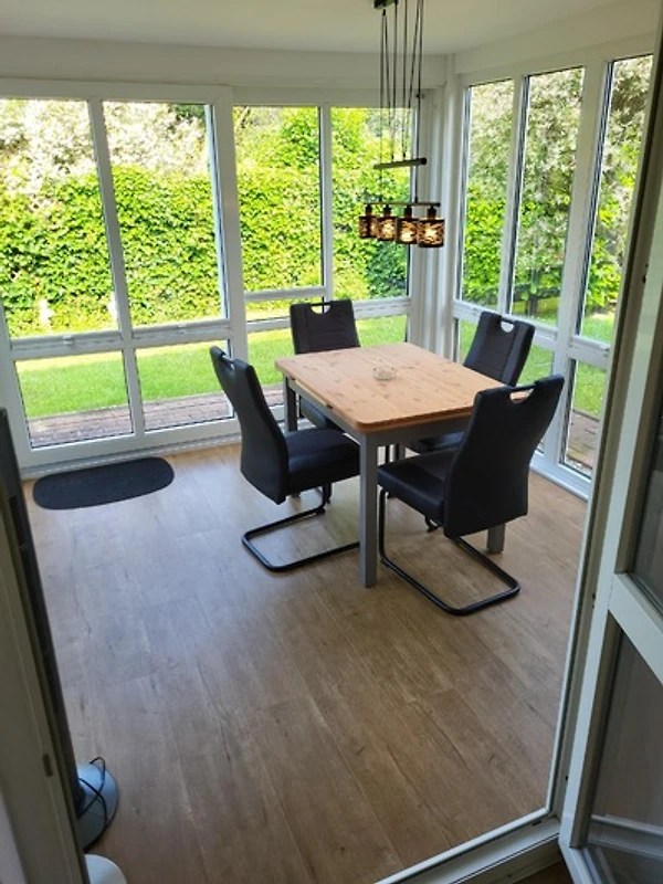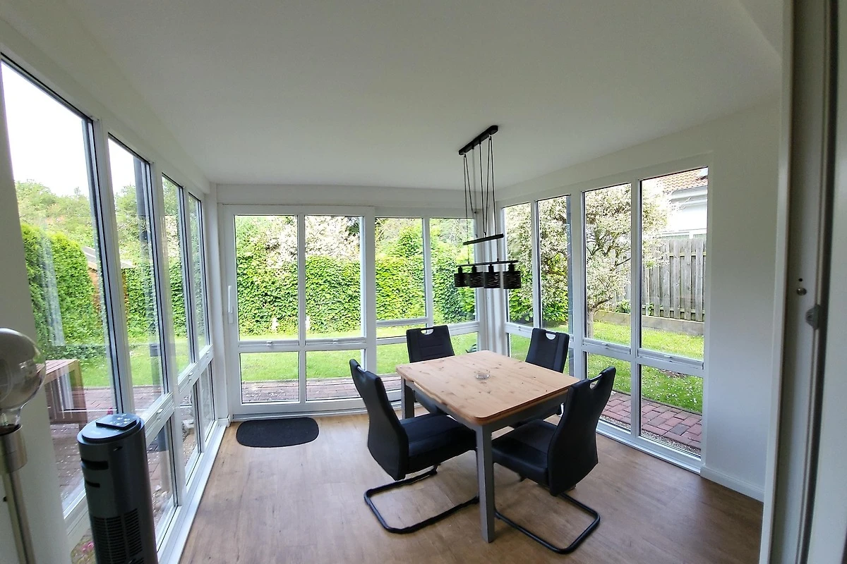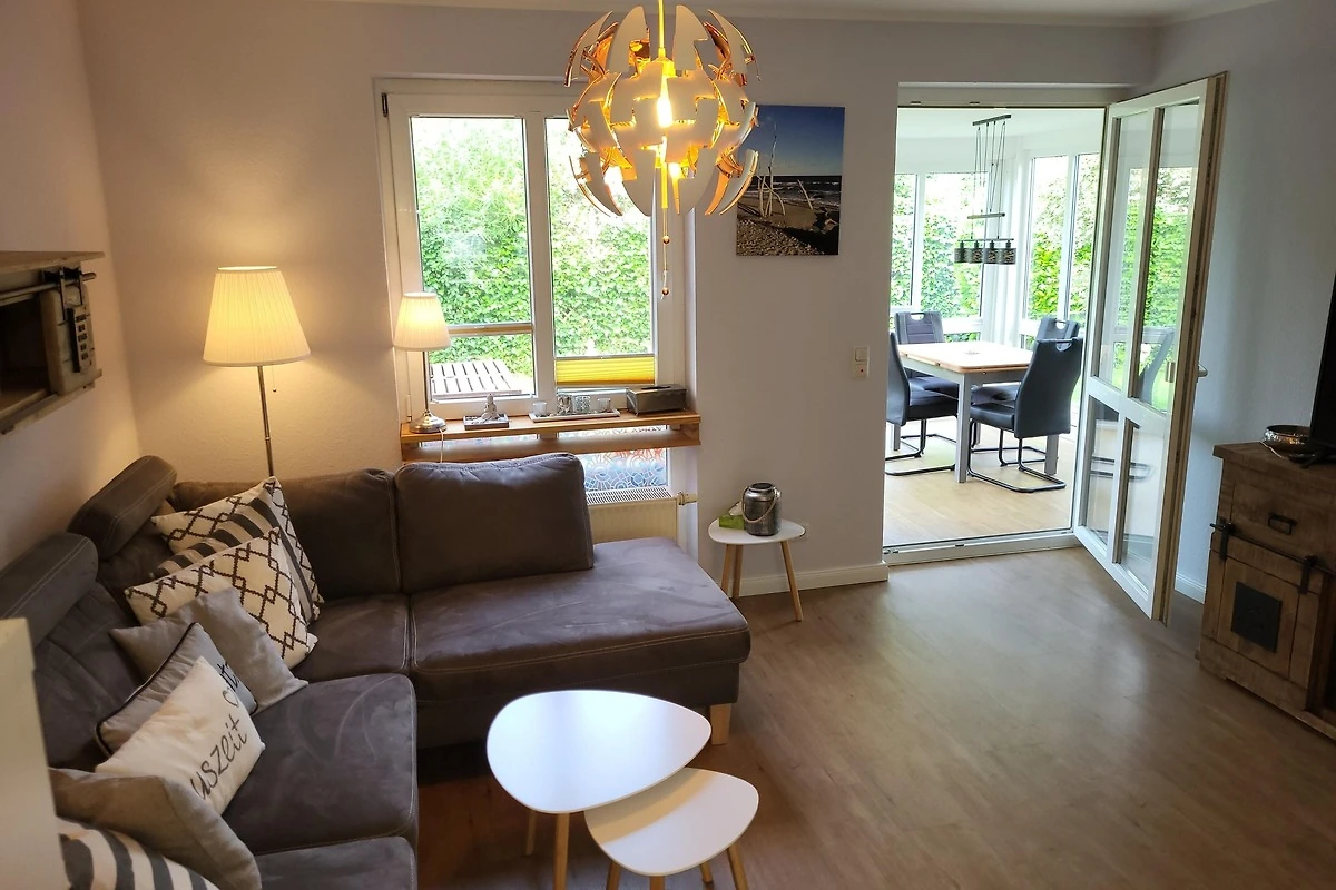 Ebenfalls vom Flur aus kommen Sie in das Wohnzimmer, hier gibt es eine Schlafcouch von 140 x 200 cm, und einen Smart TV. Die vollständige ausgestattete Küche mit Kühl- / Gefrierschrank, Backofen, Ceranfeld und Geschirrspüler ist zum Wohnbereich hin offen gestaltet und vor dem Wohnzimmer befindet sich der Wintergarten der als Essplatz ausgestattet ist.