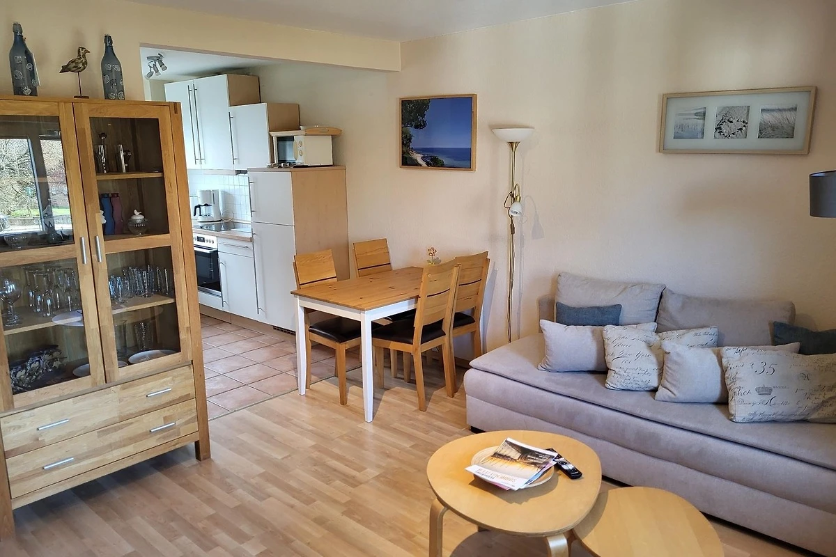 Sie verfügt über ein Wohnzimmer mit Essecke, einer angrenzenden, offenen, vollwertigen Küche inkl. Geschirrspüler und Mikrowelle.