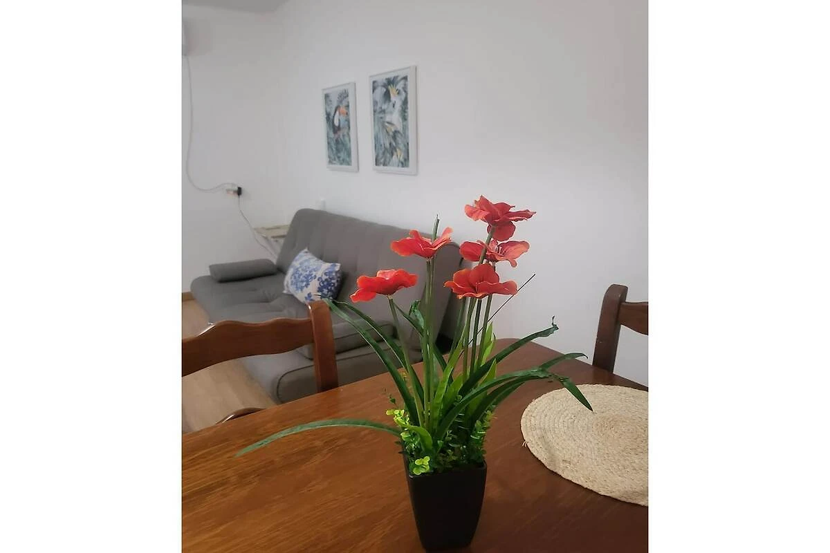 Das Apartment verfügt über eine durchdacht ausgestattete Küche, in der Sie Ihre Lieblingsgerichte zubereiten können – komplett mit Elektroherd, Kaffeepadmaschine, Mikrowelle, Geschirrspüler und sogar Entsafter und Mixer für frische Smoothies am Morgen. Der offene Wohn- und Essbereich bietet einen warmen, einladenden Raum mit Esstisch, Fernseher und Doppelschlafsofa – ideal zum Entspannen nach einem Tag in der Sonne. Zwei gemütliche Schlafzimmer mit Doppelbetten sorgen für erholsame Nächte, während das moderne Badezimmer mit ebenerdiger Dusche Ihrem Alltag einen Hauch von Luxus verleiht. Mit Klimaanlage, WLAN und Privatparkplatz ist jedes Detail für einen reibungslosen Aufenthalt konzipiert.