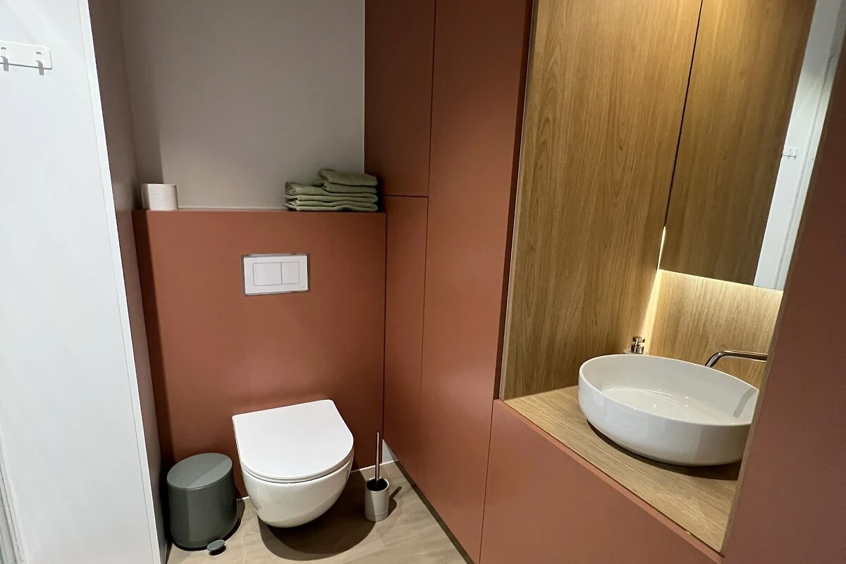 - Modernes Badezimmer mit Dusche, Waschbecken und Toilette