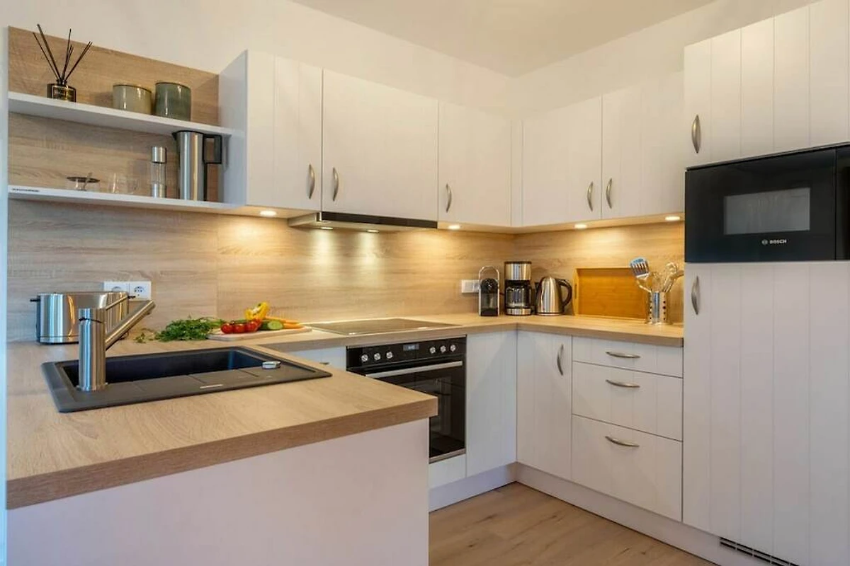 Der großzügige Wohn- und Essbereich ist mit einer modernen, voll ausgestatteten Einbauküche versehen. Diese lädt zum gemeinsamen Kochen ein.