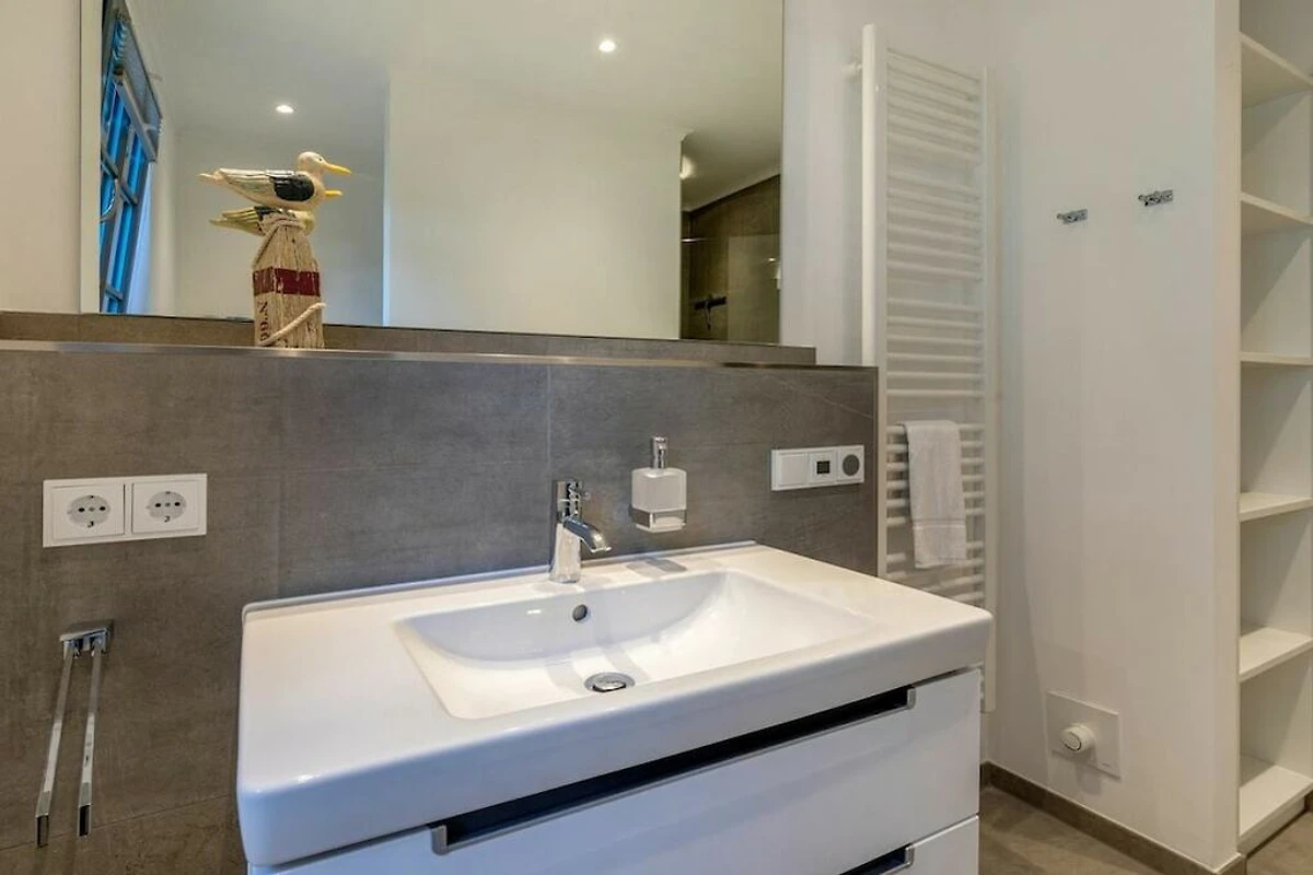 Das Badezimmer mit Dusche verfügt neben einem eingebautem Radio auch über eine Fußbodenheizung.